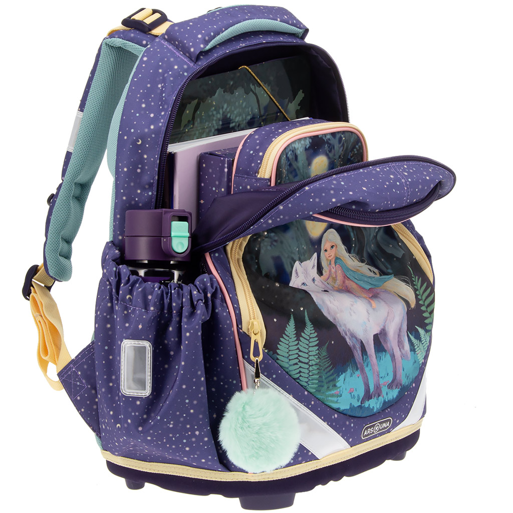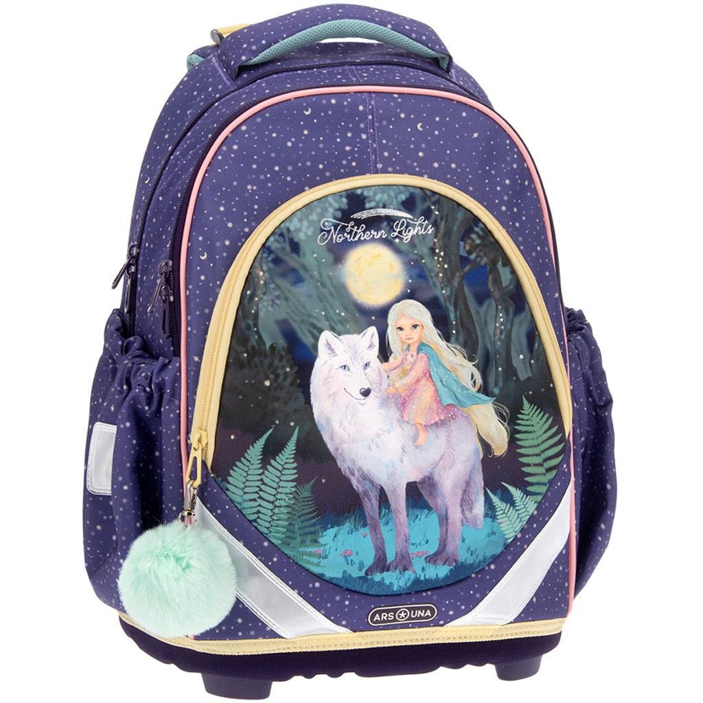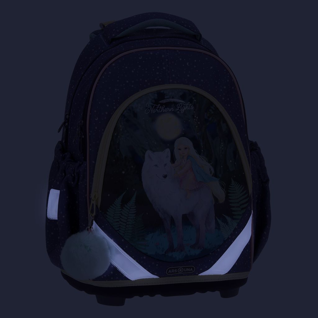 Ars Una Northern Lights anatomiczny tornister szkolny to doskonały wybór, jeśli szukasz lekkiego, a jednocześnie praktycznego i efektownego plecaka dla swojego dziecka na pierwsze lata szkoły podstawowej. Polecany szczególnie dla uczniów klas 1–3, dlatego jego konstrukcja maksymalnie odpowiada potrzebom najmłodszych. Specjalny, bajkowy wzór – dziewczynka stojąca w blasku księżyca i biały wilk – zapewnia naprawdę wyjątkowy wygląd, który dzieci pokochają.