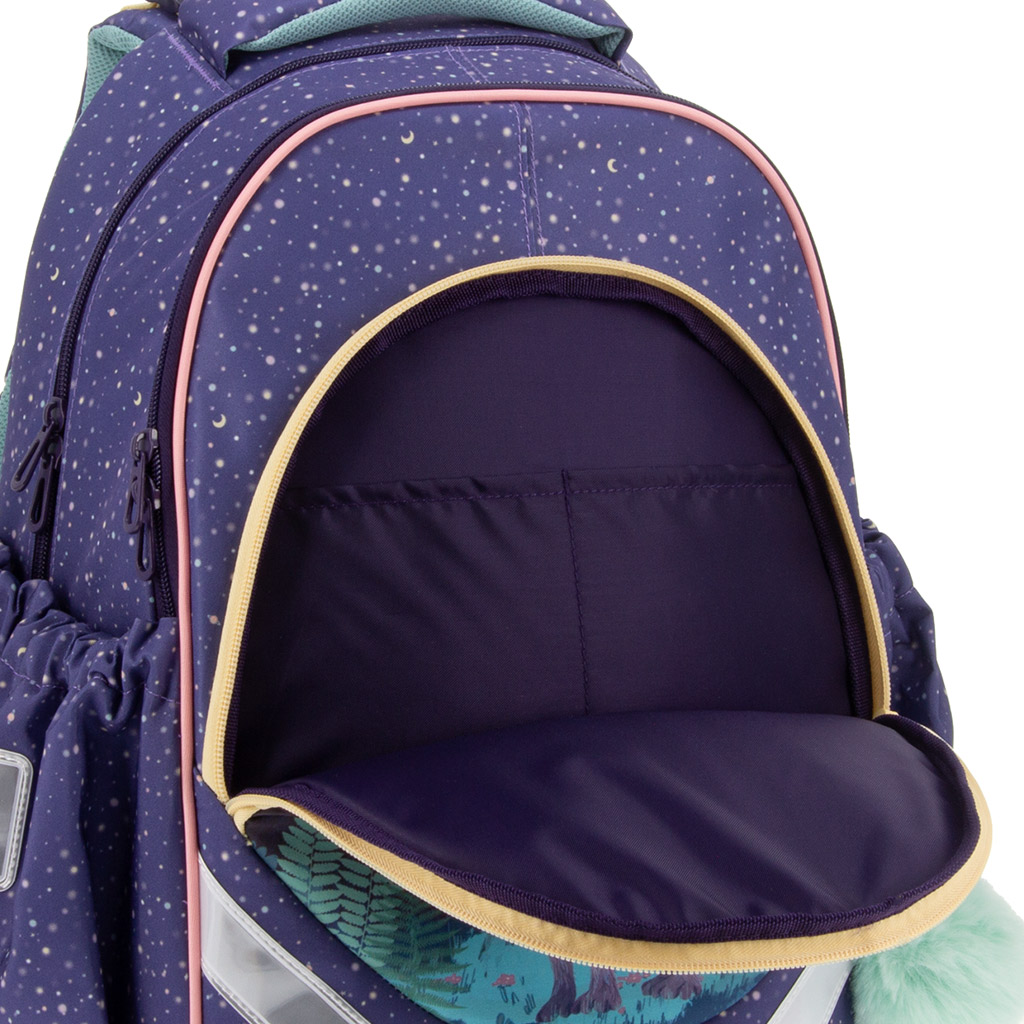 Praktyczne wnętrze ułatwia organizację: posiada trzy duże komory zapinane na zamek, z których największa ma materiałową przegrodę na książki i zeszyty. W najmniejszej komorze znajduje się osobne miejsce na przybory do pisania i dokumenty, dzięki czemu wszystkie drobiazgi są uporządkowane. Dwa boczne kieszenie z gumką idealnie nadają się na bidon lub mniejsze przedmioty.