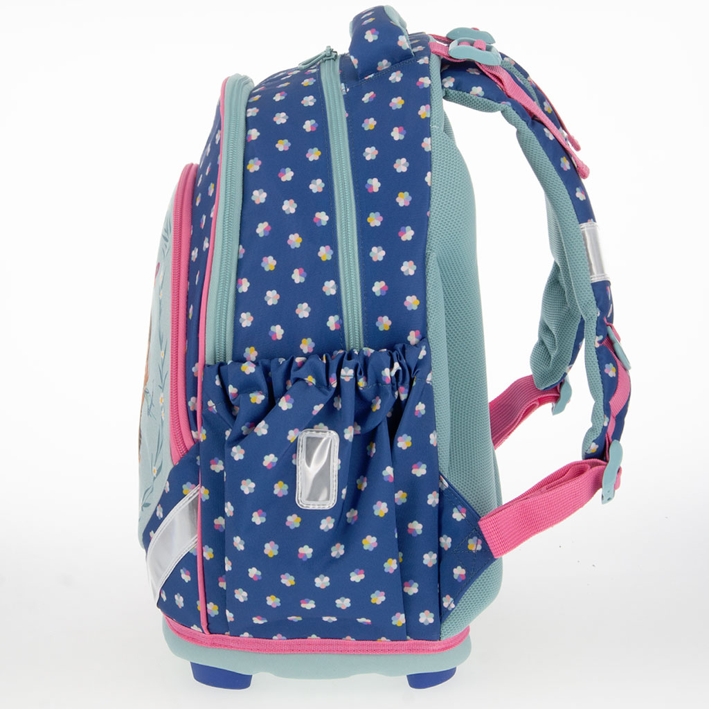 Praktycznie zaprojektowany plecak ma 3 duże komory zapinane na zamek, dzięki czemu wszystkie przybory szkolne mieszczą się w nim wygodnie. W największej komorze znajduje się materiałowa przegroda ułatwiająca uporządkowanie książek i zeszytów, natomiast w najmniejszej umieszczono osobne miejsce na przybory do pisania i na legitymację. Dwie boczne kieszenie z gumką są idealne na bidon lub mniejsze akcesoria.