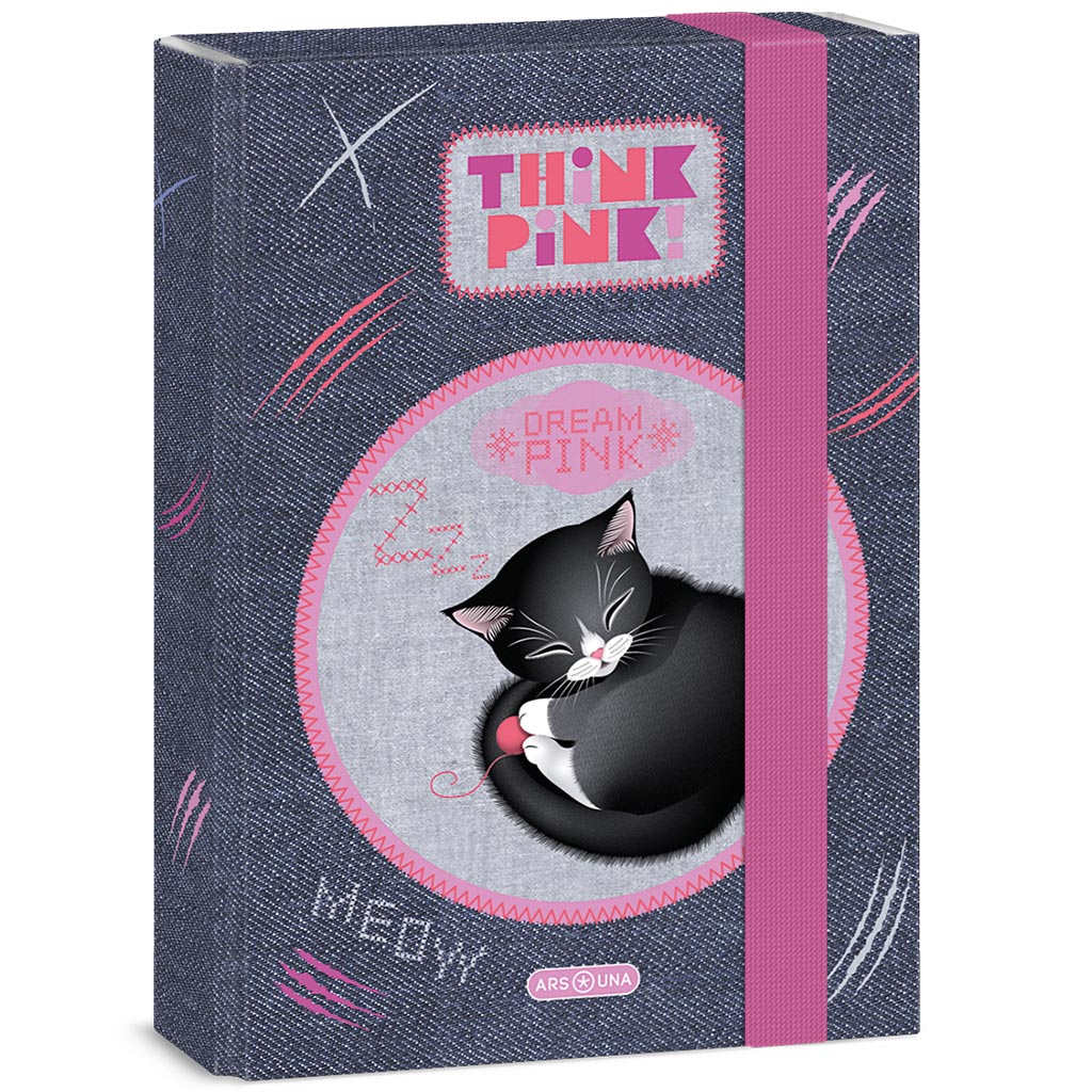 Ars Una: Think Pink pudełko na zeszyty A/5 z kotkiem to doskonały wybór, jeśli chcesz przechowywać zeszyty swojego dziecka stylowo i bezpiecznie. Urocza grafika ze śpiącym kotkiem i różowe detale nadają naprawdę miły i modny wygląd, który szczególnie spodoba się dziewczynkom. Wytrzymała, twarda kartonowa okładka chroni zeszyty przed zgnieceniami podczas codziennego użytkowania. Grubość grzbietu 4 cm zapewnia wystarczająco miejsca na kilka zeszytów lub dokumentów, natomiast gumka o szerokości 2 cm sprawia, że wszystko pozostanie bezpiecznie na swoim miejscu w torbie.