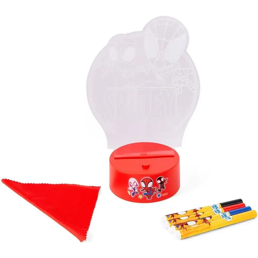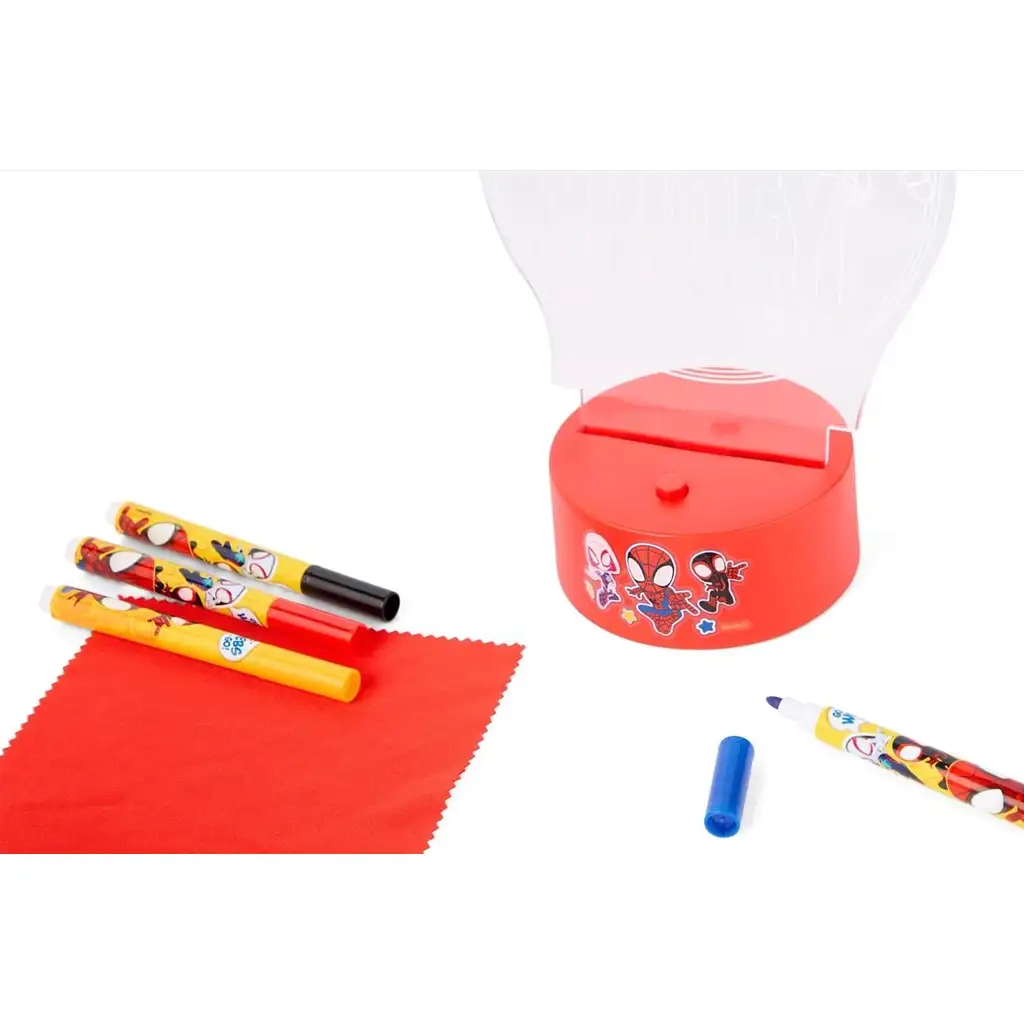 Zestaw zawiera podstawę z lampką LED, przezroczystą podświetlaną płytkę ozdobioną wzorem Spidey’ego i przyjaciół, a także 4 intensywne kolorowe pisaki, dzięki którym dzieci mogą dowolnie kolorować wybrany motyw. Po ukończeniu dzieła światło LED ożywia rysunki – stają się nie tylko twórczą zabawą, ale również praktycznym, uspokajającym źródłem światła na noc. Lampka oferuje trzy poziomy jasności, dzięki czemu można ją idealnie dostosować do nastroju pokoju i przyzwyczajeń związanych ze snem.