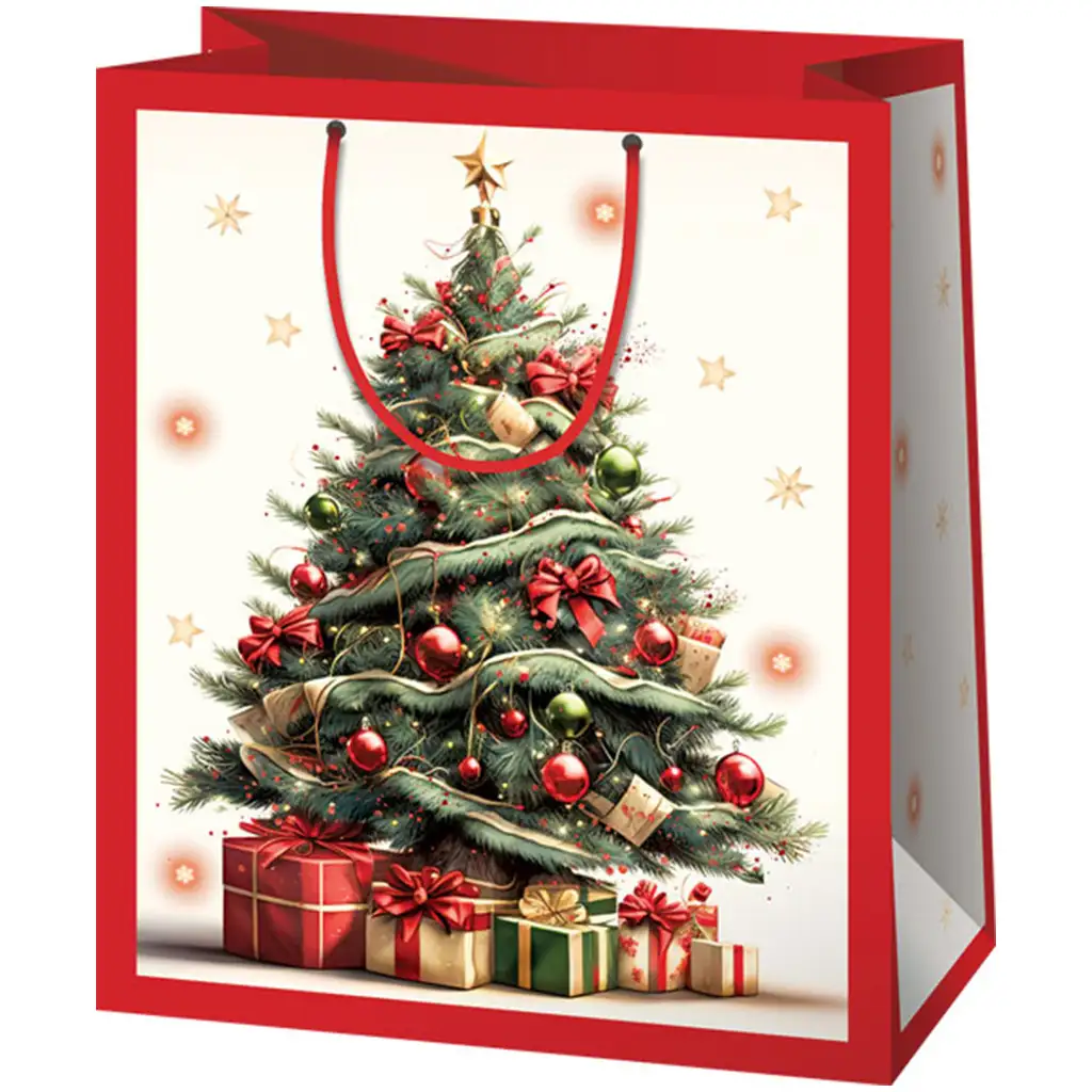 Przynieś ducha świąt Bożego Narodzenia z naprawdę efektowną i uroczystą torbą na prezent! Ta gigantyczna torba prezentowa Cardex (33x15x44 cm) przedstawia klasyczną, bogato udekorowaną choinkę, pod którą znajdują się kolorowe pudełka na prezenty, przewiązane wstążkami. Czerwone obramowanie, złote gwiazdy i zielono-czerwone ozdoby doskonale oddają ciepło i radość świąt.