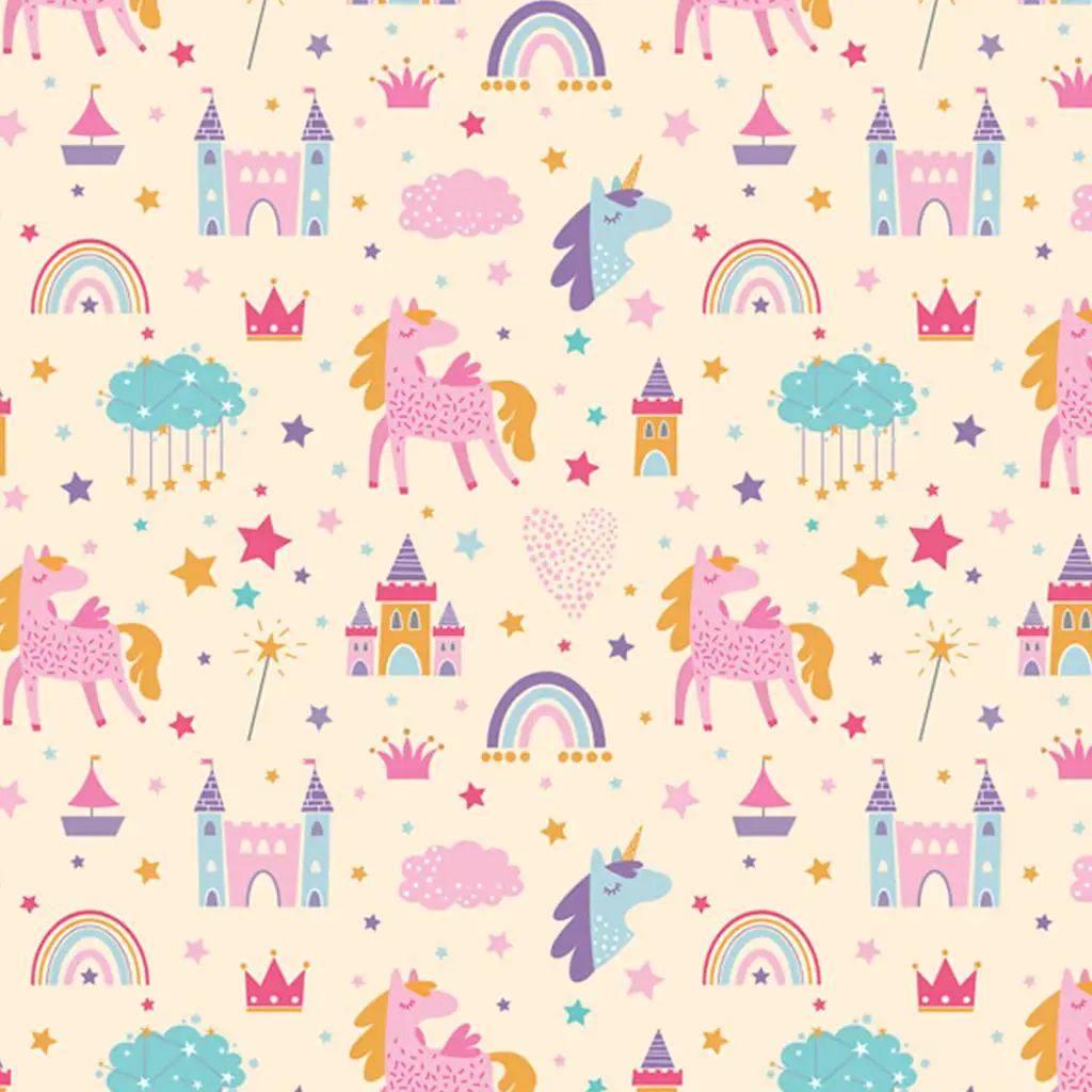 Zaczaruj małe dziewczynki już przed otwarciem prezentu dzięki tej bajecznej, 100x70 cm wielkości, papierowi do pakowania z motywem jednorożców! Uroczy design zdominowany jest przez różowe, fioletowe i pastelowe odcienie. Na powierzchni papieru widnieją uśmiechnięte jednorożce, zamki jak z bajki, tęcze, magiczne różdżki, chmurki, korony i gwiazdki – jakby prawdziwa baśń ożyła na papierze.