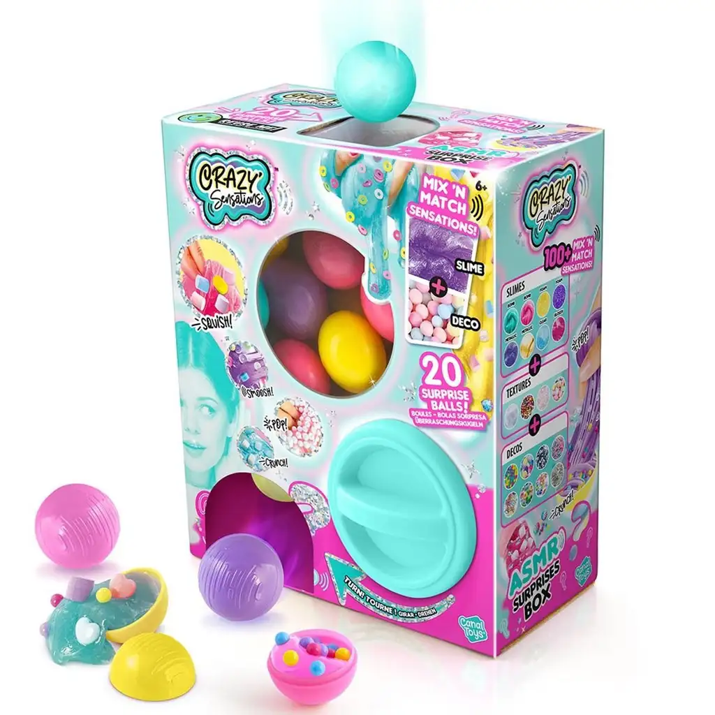 Crazy Sensations ASMR Niespodziankowe Pudełko to idealne połączenie kreatywności, zabawy i doznań sensorycznych, za które dzieci (a w tajemnicy także dorośli) je uwielbiają! W pudełku znajduje się 20 kolorowych kul-niespodzianek, z których każda oferuje unikalne doświadczenie sensoryczne. Możesz znaleźć w środku kleiste, piankowe, żelowe, skaczące, perełkowe i teksturowane slime’y, które można mieszać, ugniatać i formować według własnego uznania.