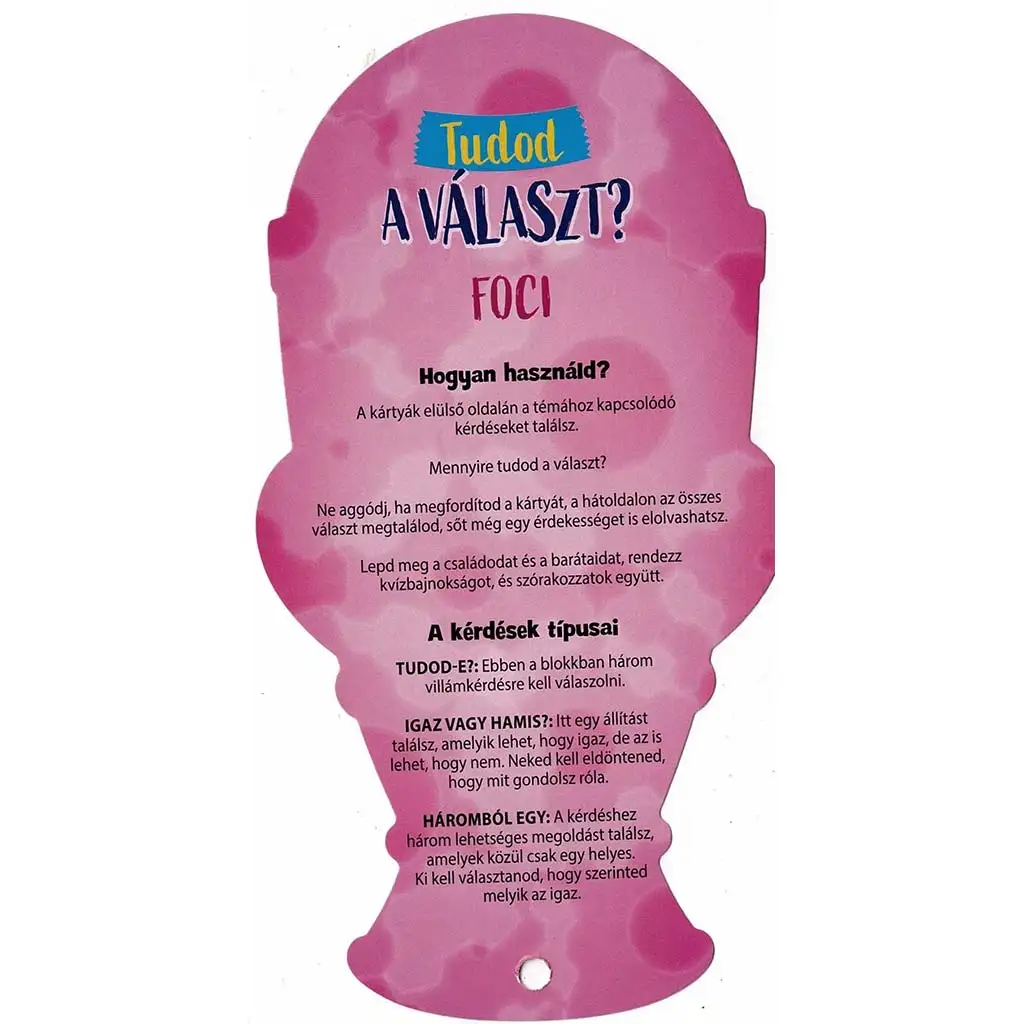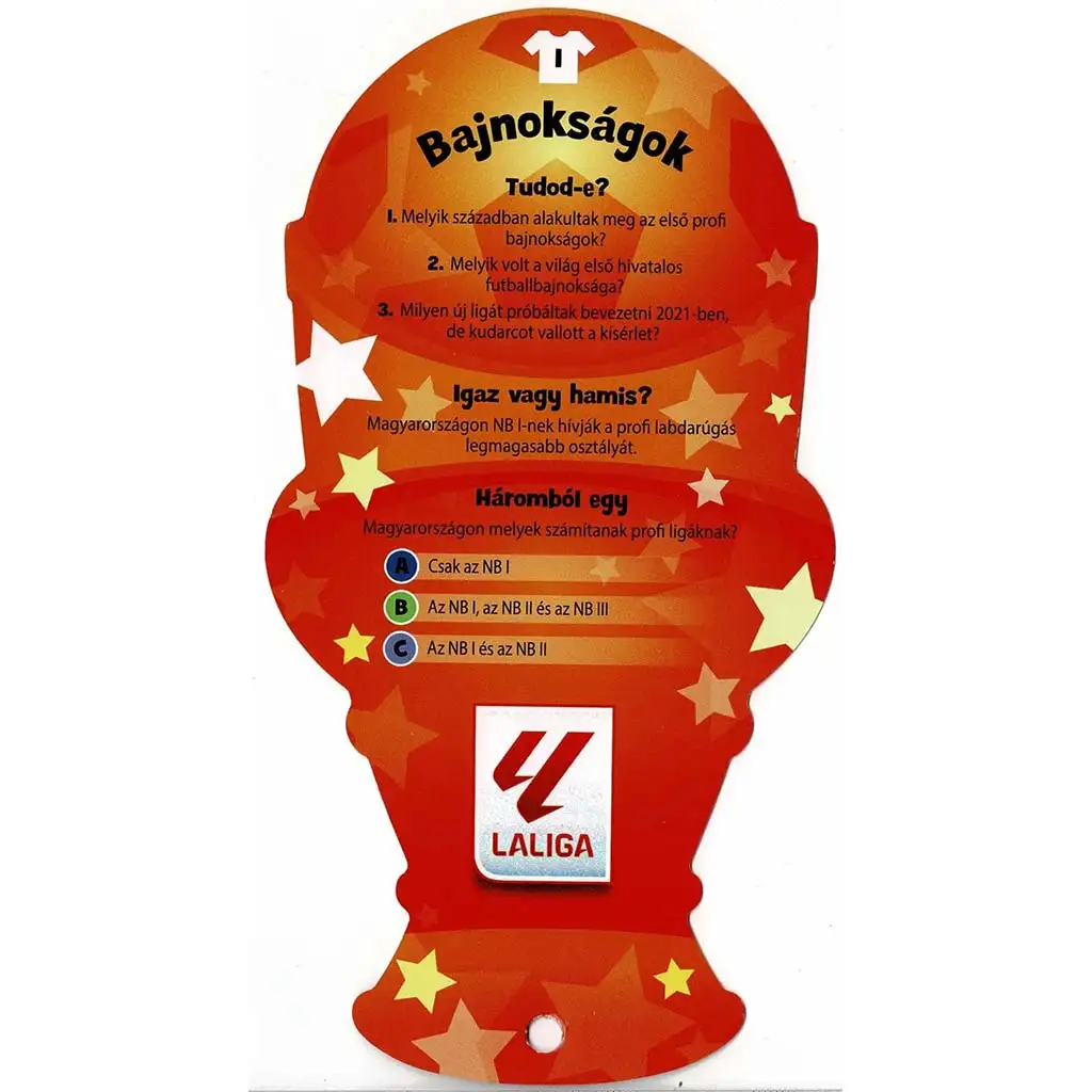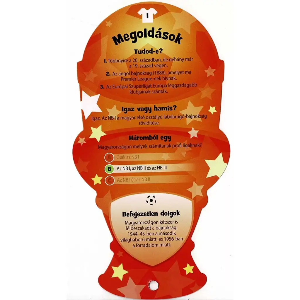 Ten wyjątkowy zestaw kart w kształcie trofeum polecany jest od 8. roku życia i w przystępny sposób wprowadza dzieci w podstawy i ciekawostki związane z piłką nożną. Jakie ligi węgierskie są uznawane za profesjonalne? Kiedy powstały pierwsze zawodowe ligi? Czym jest Superliga i dlaczego się nie udała? Pytania występują w trzech rodzajach: pytania błyskawiczne (CZY WIESZ?), stwierdzenia prawda/fałsz oraz zadania z trzema możliwymi odpowiedziami – wszystkie motywują do myślenia, szukania informacji i nauki przez zabawę.