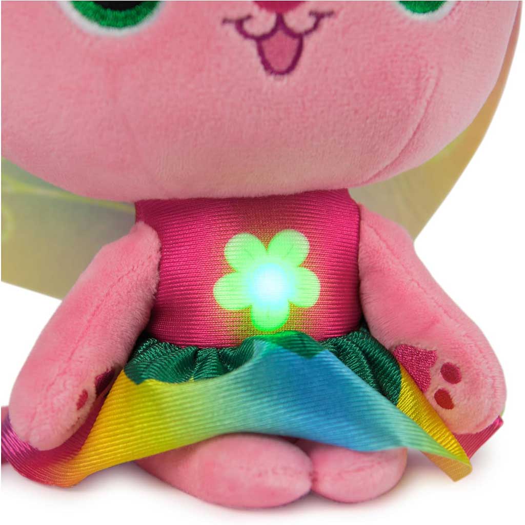 Specjalna funkcja świetlna sprawia, że zabawka jest jeszcze bardziej ekscytująca: mały kwiatek na brzuszku świeci, tworząc jeszcze bardziej magiczną atmosferę, nawet podczas wieczornych opowieści. Pluszak posiada różne efekty świetlne i dźwiękowe, które wprowadzają rozmaite nastroje, dzięki czemu dziecko łatwo zaangażuje się w pełną wyobraźni zabawę. Ta urocza postać nie tylko bawi, ale także wspiera rozwój emocjonalny i kreatywność. Idealny prezent dla każdego fana Gabi babaháza, który lubi bajkowy, wróżkowy świat.