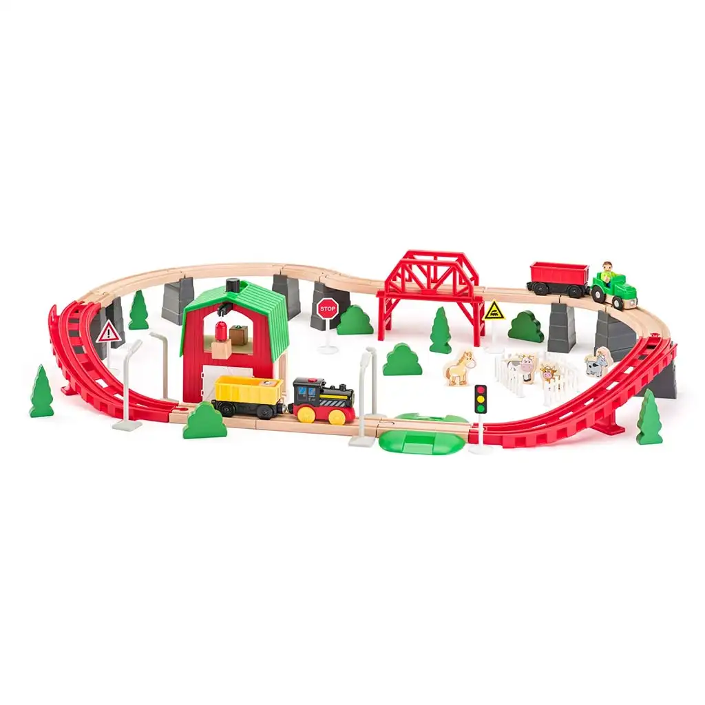 Drewniany, rolniczy zestaw torów kolejowych z pociągiem i dodatkami — 60 elementów — przynosi prawdziwą przygodę do pokoju dziecięcego. Szczegółowa, farmowa sceneria toru z mostami, podjazdami i zakrętami sprawia, że zabawa jest jeszcze bardziej ekscytująca. Obok lokomotywy i wagonu w zestawie znalazły się także traktor, figurki zwierząt, drzewa, znaki drogowe oraz klimatyczny budynek gospodarczy, dzięki czemu Twoje dziecko może tworzyć wiejskie historie na nowo i na nowo.