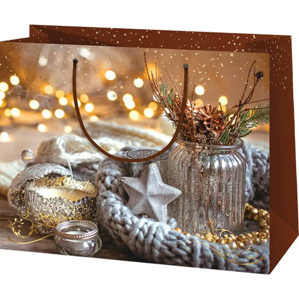 Ta duża torba prezentowa przywołuje ducha i magię sezonu świątecznego. Ozdoba torby w świątecznym, bożonarodzeniowym stylu, na której pojawiają się magiczne elementy i świąteczne światła, z pewnością przywoła ciepło grudniowych dni oraz ekscytację związaną z przygotowaniami do świąt. Torba o wymiarach 27x14x33 cm oferuje dużo miejsca na prezenty – czy to książka, zabawka, czy wyjątkowy element garderoby. Mocne sznurkowe uchwyty zapewniają wygodny chwyt, dzięki czemu torbę łatwo i bezpiecznie można przenosić, nawet z cięższymi upominkami. Wzmocnione dno dba o to, aby torba nie traciła kształtu, a prezenty stały w niej stabilnie. Wykonana z błyszczącego, laminowanego papieru torba nie tylko jest wytrzymała, ale także prezentuje się wyjątkowo elegancko, dzięki czemu opakowanie samego prezentu zapadnie w pamięć obdarowanej osobie.