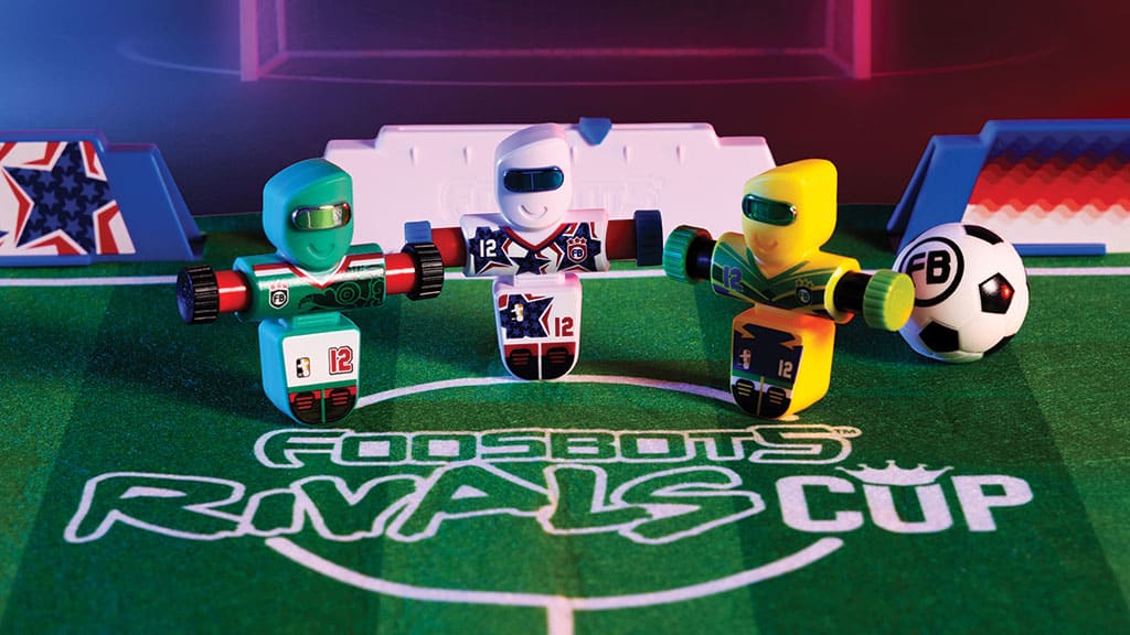 Dzieci mogą sprawdzić swoje umiejętności w ekscytującym turnieju piłkarskim dzięki temu zestawowi do gry. Wystarczy nacisnąć ramiona figurki Foosbots i obserwować, jak się obraca! Można grać drużyną Brazylia, USA lub Meksyk (wszystkie są w zestawie), ale także innymi krajami, które są dostępne osobno.