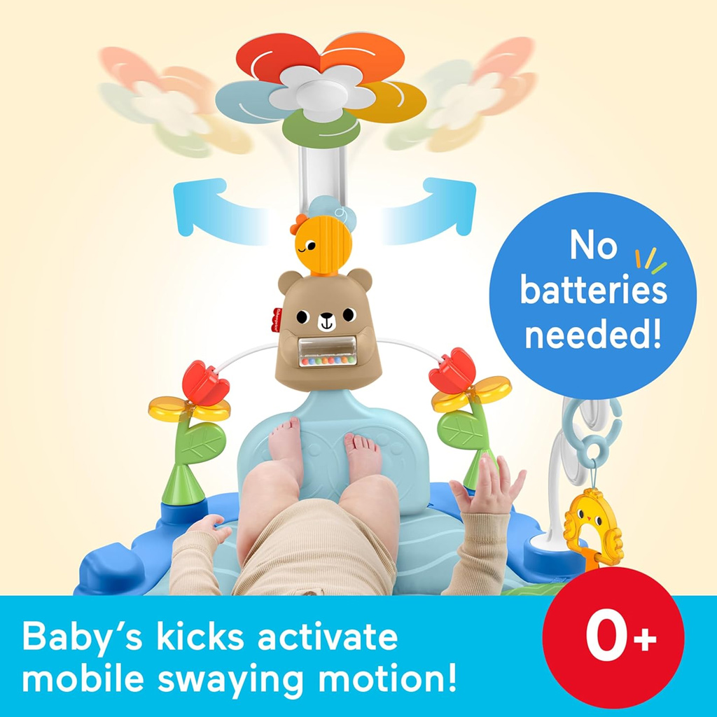 Interaktywna mata do zabawy z misiem Mattel Fisher-Price to doskonały wybór, jeśli chcesz już od noworodka w zabawowy sposób rozwijać zmysły i ruchy swojego dziecka. Na miękkiej, kolorowej macie, leżąc na plecach lub na brzuszku, maluszek może odkrywać różne tekstury, dźwięki i kształty. Obracający się kwiat i wiszące zabawki podłączone do centralnego elementu — misia — reagują na ruchy dziecka, dzięki czemu każde kopnięcie staje się ekscytującym przeżyciem. Interaktywne elementy wspierają rozwój koordynacji wzrokowo-ruchowej, a dziecko może także obserwować siebie w lusterku. Praktyczne jest to, że nie wymaga baterii, więc mata zawsze jest gotowa do zabawy, w domu lub w podróży.