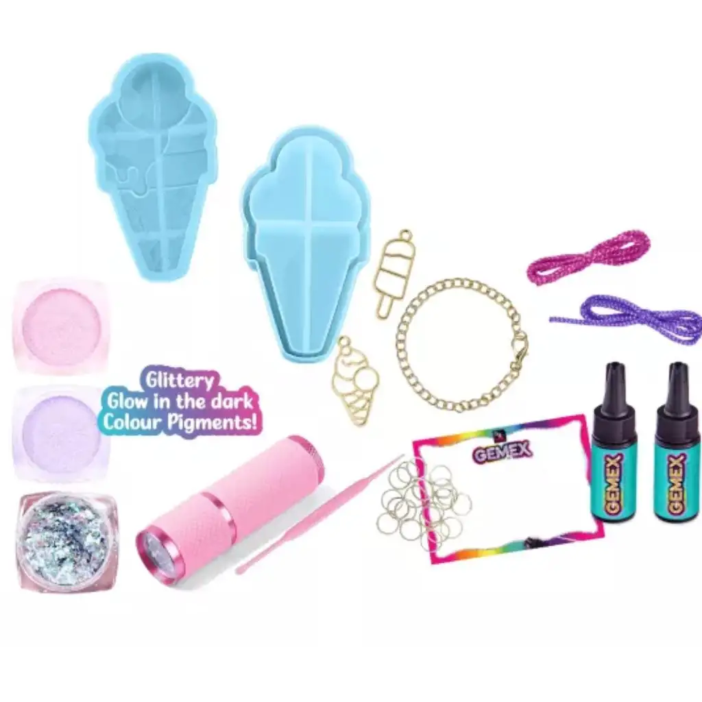 Odkryj radość tworzenia słodkich dzieł z zestawem Gemex: Ice Cream Delights – Tworzenie biżuterii z żelowych klejnotów w kształcie lodów! Dzięki temu wyjątkowemu zestawowi dzieci mogą stworzyć własną, błyszczącą i pachnącą biżuterię w kształcie lodów, która doskonale odzwierciedla ich osobowość. Magia jest prosta: wystarczy wlać żel do foremki w kształcie loda, udekorować brokatem i pigmentami świecącymi w ciemności, a następnie naświetlić dołączoną lampką – już po kilku minutach powstaną trwałe, gotowe do noszenia ozdoby!