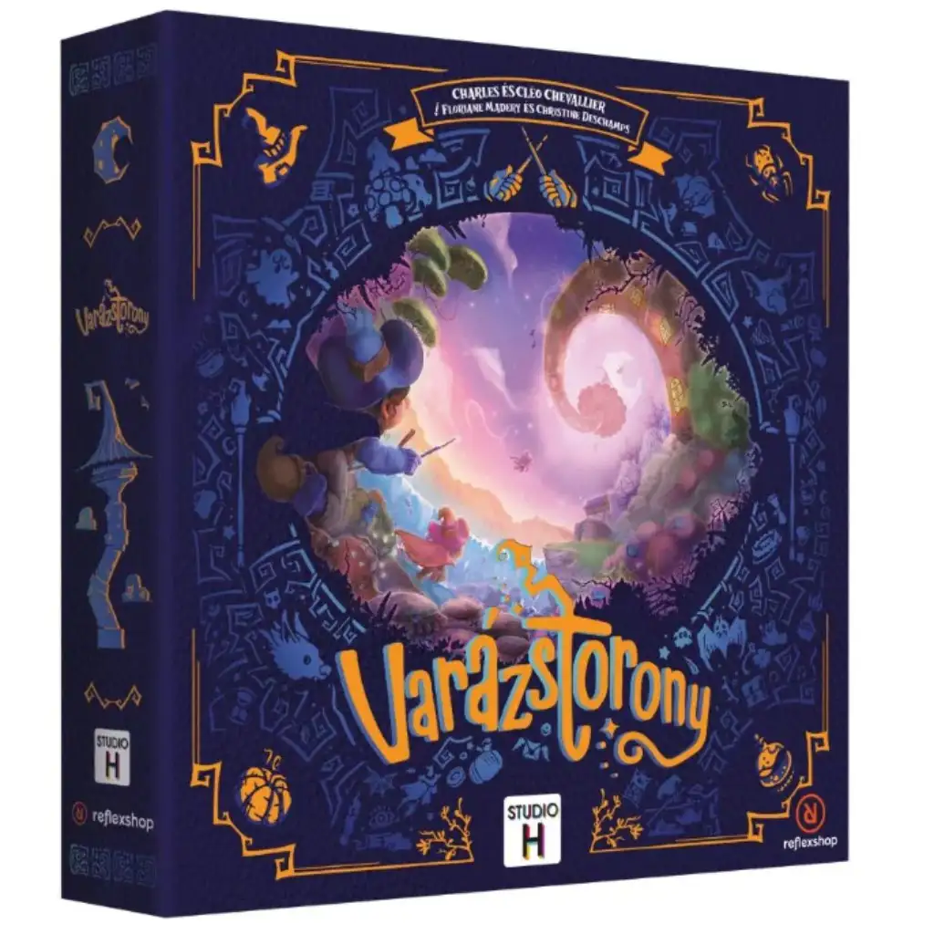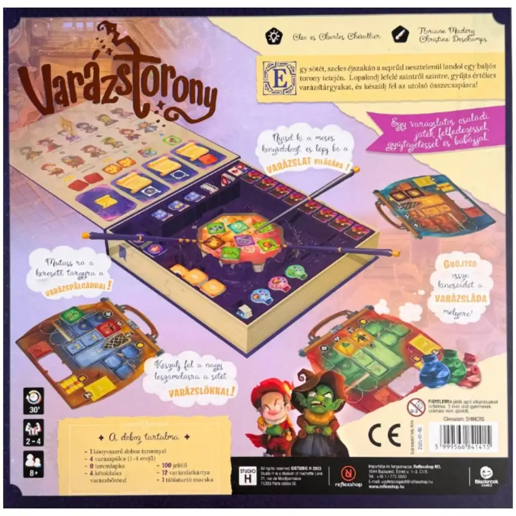 Wieża Czarów to łatwa do nauczenia, a zarazem taktyczna gra planszowa ukryta w bajkowym pudełku na książki, w której wyruszacie na przygodę do tajemniczej, mrocznej wieży pełnej sekretów. Przemierzając poziom po poziomie, przeszukujecie sale, zbieracie cenne magiczne przedmioty i przygotowujecie się do ostatecznego starcia z mrocznymi czarodziejami, które czeka was w krypcie. Każdej rundy wybieracie znacznik, który chcecie zdobyć, po czym jednocześnie wskazujecie go swoją magiczną różdżką – dobre wyczucie czasu oraz podejmowane ryzyko nagradzane są złotem, składnikami, broniami i zaklęciami.