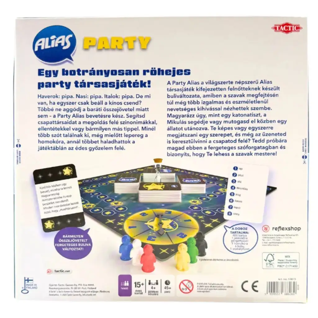 Zasady gry są takie same jak w oryginalnej wersji Alias, czyli musisz pomóc swojemu partnerowi odgadnąć słowo znajdujące się na Twojej karcie, używając do tego wyłącznie innych słów! W wersji Party, oprócz opisywania, otrzymujesz jednak dodatkowe zadanie, dlatego w trakcie gry musisz mówić zgodnie z nietypowymi instrukcjami, na przykład jak komentator sportowy albo jak robot. Wyobrażasz sobie, żeby wytłumaczyć jakieś słowo jak instruktor wojskowy, złośliwy skrzat albo jak zwierzę? Party Alias to nagradzana gra imprezowa z fantastycznymi wyzwaniami! Bądź kreatywny i wyjaśniaj słowa z kart, nie używając ich bezpośrednio! Używaj synonimów, antonimów albo opisz dane pojęcie innymi słowami! Odgadnijcie jak najwięcej słów, zanim przesypie się cały piasek w klepsydrze! Dotarcie do mety jako pierwsi to Wasz cel!