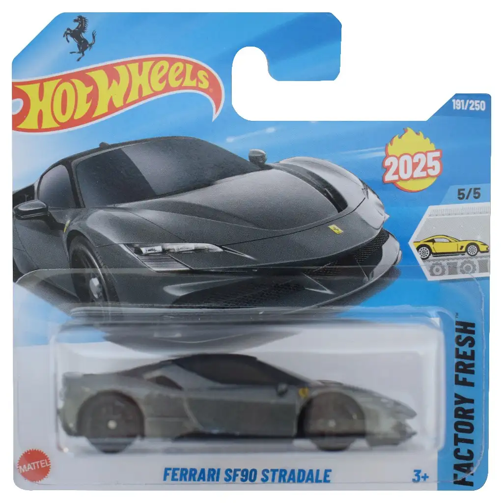 Hot Wheels Ferrari SF90 Stradale w skali 1:64 to model jednego z najwybitniejszych osiągnięć włoskiej motoryzacji, dostępny w eleganckim, szarym kolorze. To wydanie z roku 2025 jest piątą z pięciu propozycji serii Factory Fresh, odwzorowujące prawdziwego hybrydowego supersamochoda Ferrari SF90 z charakterystycznymi, agresywnymi liniami i precyzyjnym wykończeniem, do których marka już przyzwyczaiła.