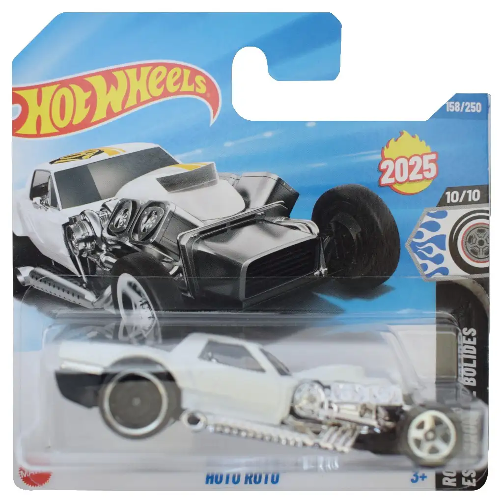 Obok białej karoserii najbardziej rzuca się w oczy ogromny, chromowany silnik, który dosłownie wystaje poza nadwozie, nadając modelowi prawdziwy hot rodowy charakter. Długie rury wydechowe, masywny przedni grill oraz wyjątkowe proporcje sprawiają, że Hoto Roto to raczej fantazyjna maszyna o ogromnej mocy niż tradycyjny samochód. Ogromne tylne koła i wąskie przednie przywodzą na myśl klasyczne dragstery, które Hot Wheels wzbogacił własnym, zabawnym akcentem.