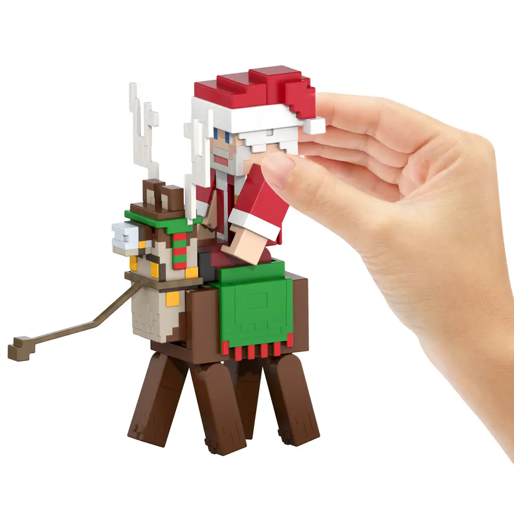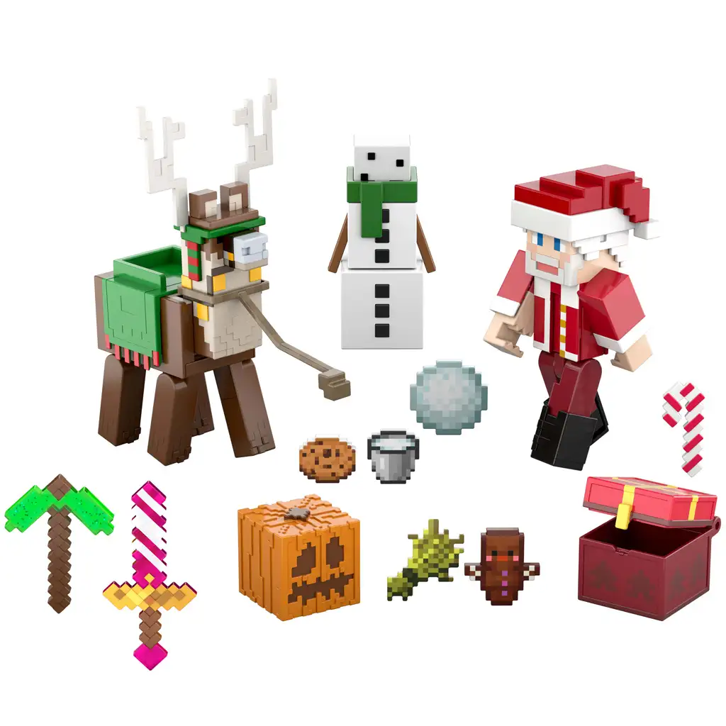 W kalendarzu znajdziesz 3 figurki o wysokości 8,25 cm: Steve’a w stroju Mikołaja, zabawną Jolly Llamę oraz bałwana (Snow Golem). Dodatkowo w zestawie znajduje się 17 klasycznych akcesoriów Minecraft (np. broń, słodycze, dekoracje, przedmioty), a także 4 błyszczące naklejki. Figurki i akcesoria oddają kultowy, pikselowy styl gry Minecraft, dzięki czemu dzieci mogą poczuć się jak w świecie gry.