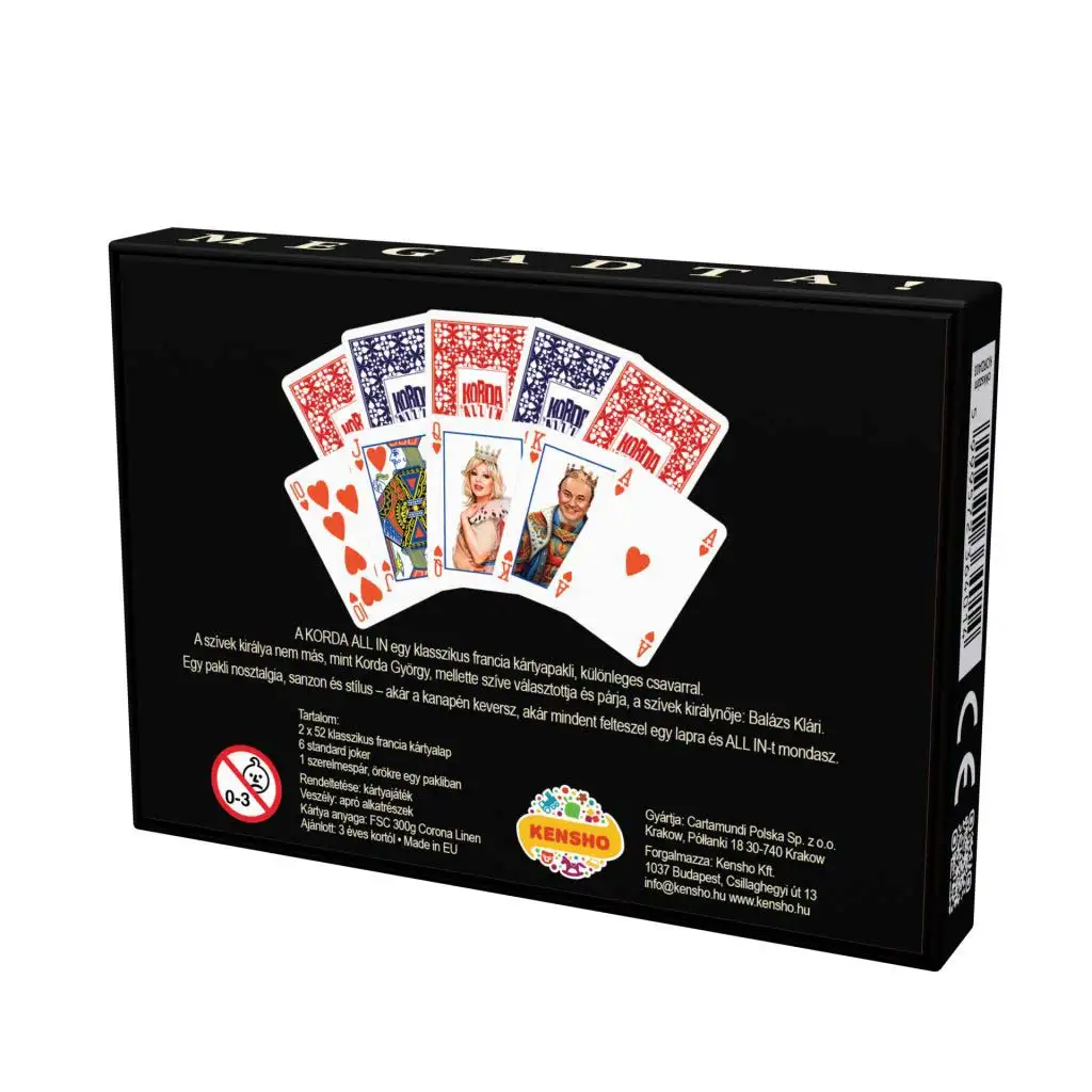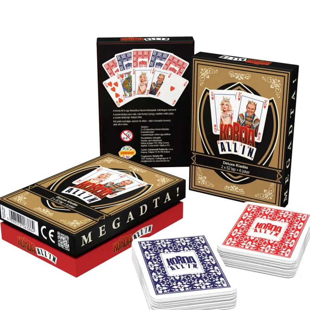 Korda All-In Deluxe francuska podwójna talia kart (2×52 karty + 6 jokerów) to prawdziwa perełka klasycznej gry karcianej, która wnosi na stół nie tylko radość rozgrywki, ale także styl i humor. To wyjątkowe, premium wydanie zawiera dwie pełne talie francuskich kart, w sumie 104 karty i 6 jokerów, co czyni ją idealnym wyborem dla większych grup lub dłuższych, poważniejszych rozgrywek – czy to poker, remik, makao, czy inna popularna gra karciana.