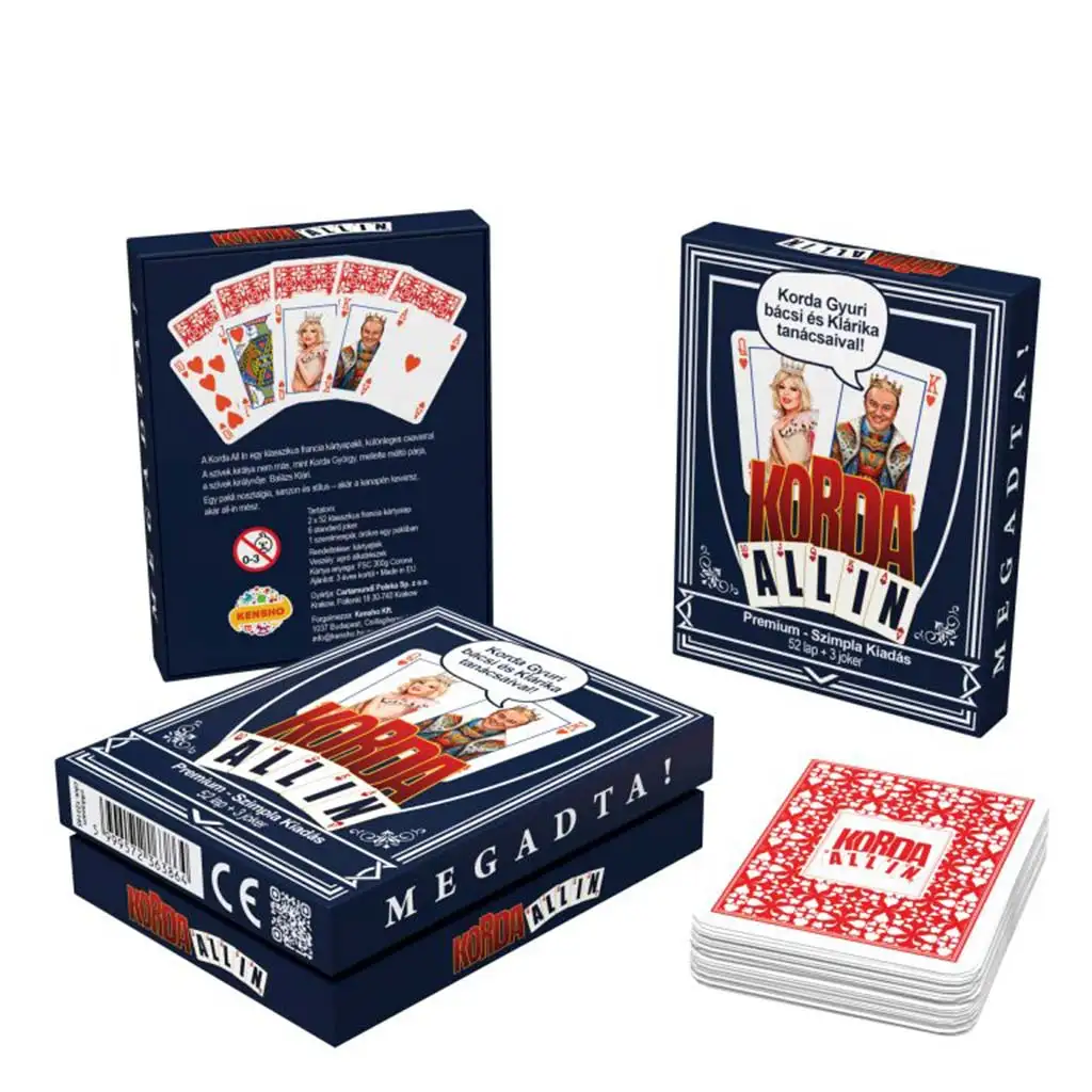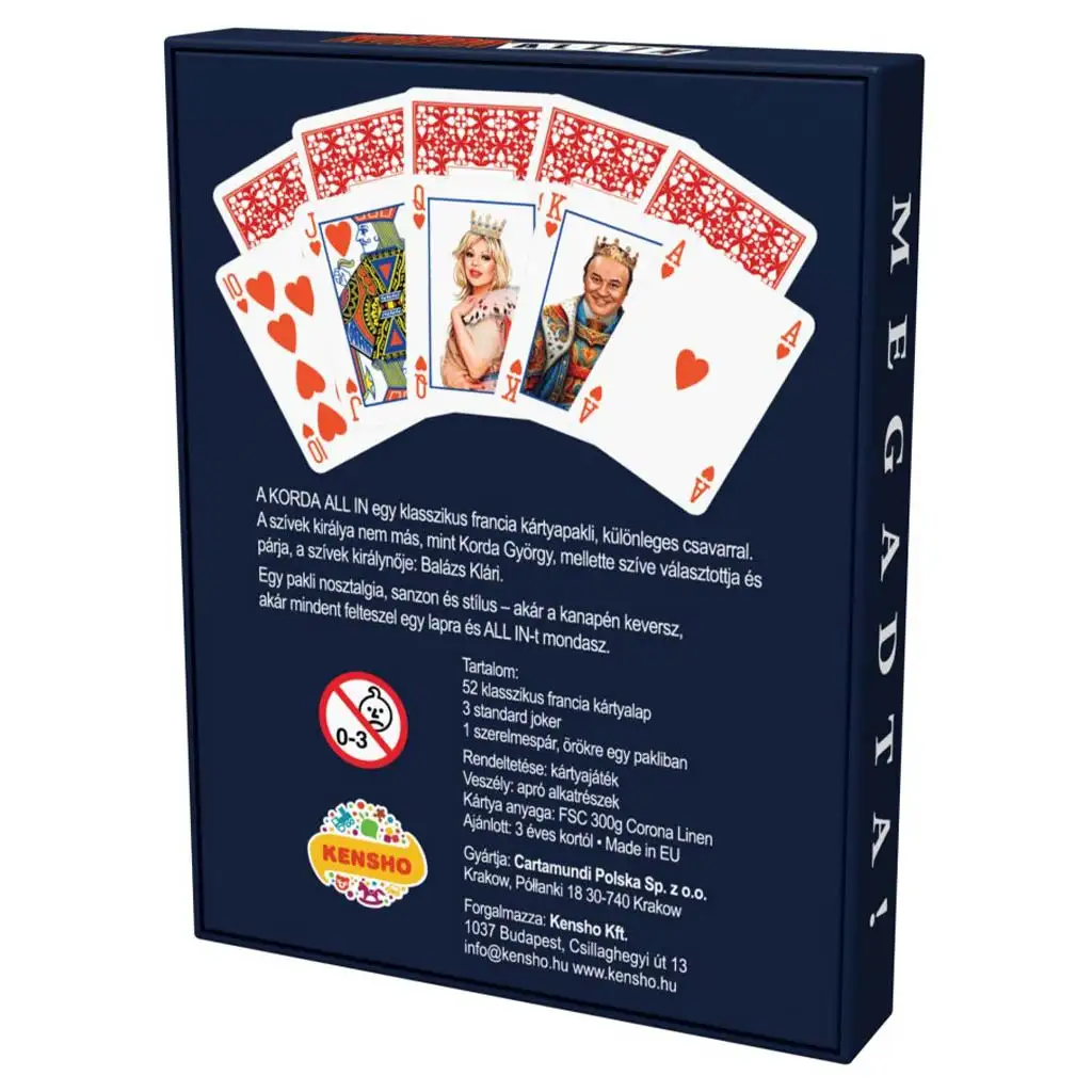 Korda All-in Klasyczna talia kart francuskich (52 karty + 3 jokery) stanie się nowym ulubieńcem miłośników pokera, gdzie jakość spotyka się ze stylem – z małym węgierskim akcentem! To nie jest tylko tradycyjna talia kart, lecz prawdziwa nostalgicza wyjątkowość, w której królem kierów jest György Korda, a obok niego jego wierna towarzyszka Klári Balázs pojawia się jako królowa kier. Znane karty francuskie w tym wydaniu premium ożywają na nowo – stylowo, wyjątkowo i gwarantują uśmiech na twarzy każdego gracza.