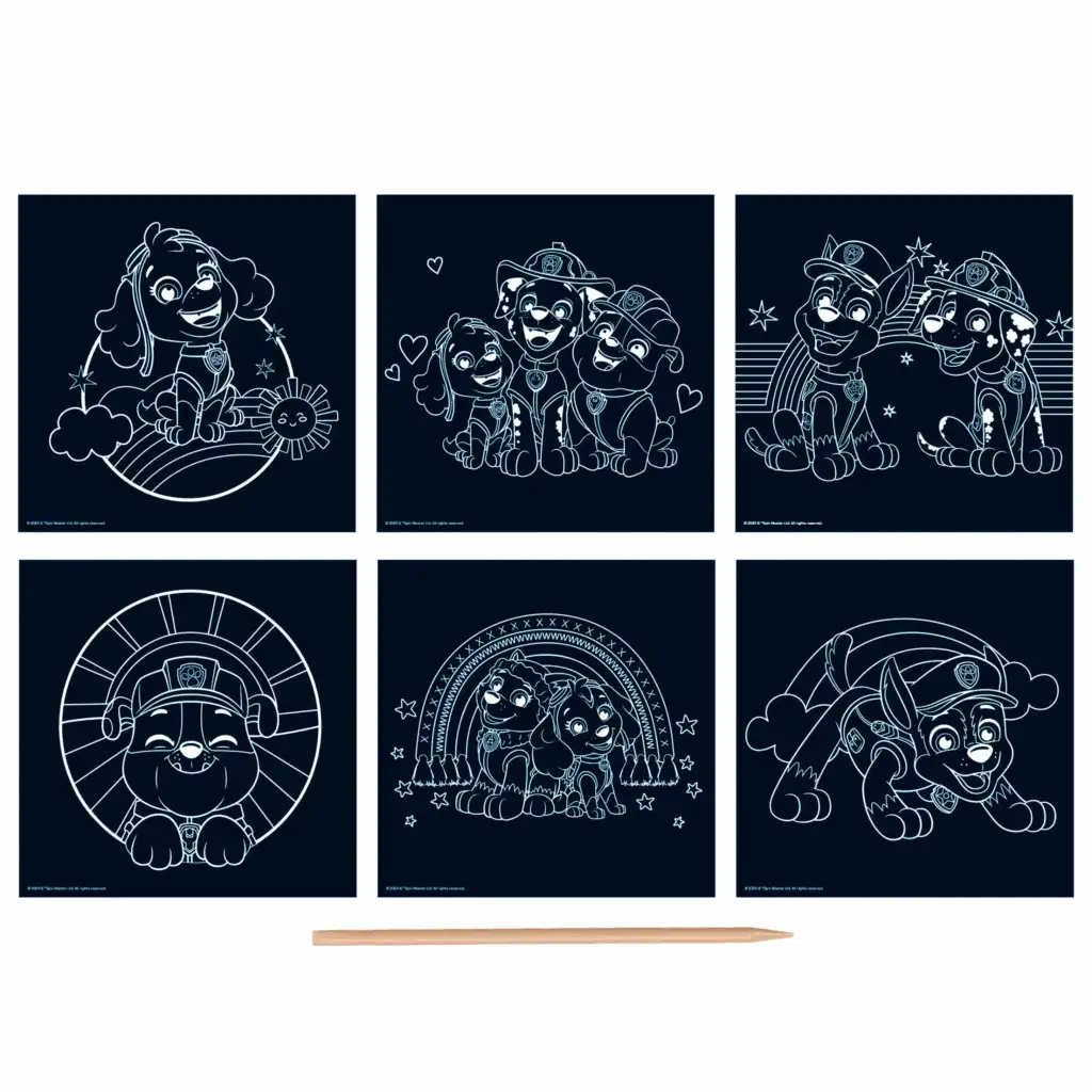 - 6 wstępnie narysowanych czarnych obrazków do zdrapywania z motywami Psiego Patrolu