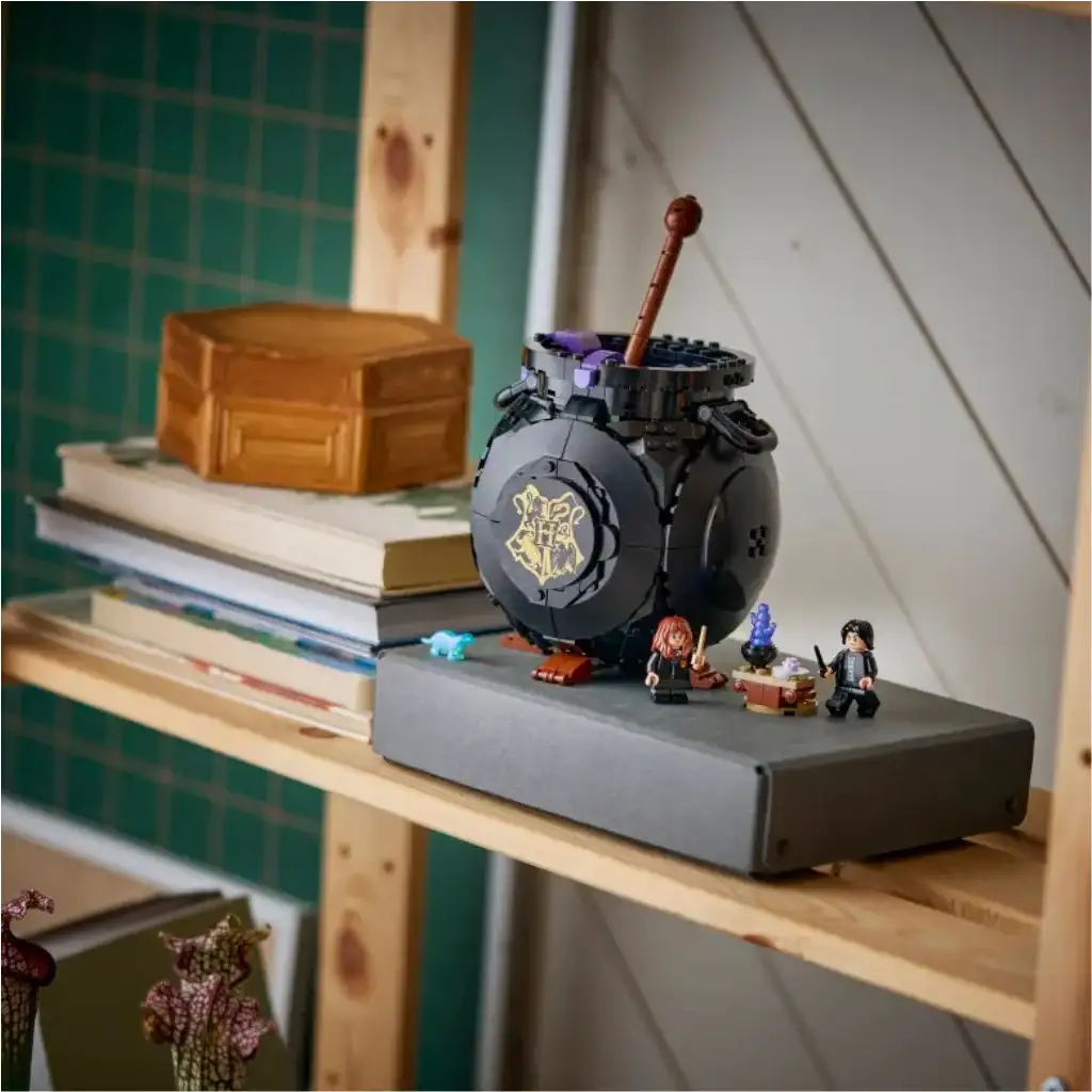 Zaskocz dzieci magicznym zestawem konstrukcyjnym LEGO® Harry Potter™ (76464), który mogą zarówno wystawić na półce, jak i się nim bawić: to kocioł z ukrytą klasą eliksirów w środku. Porusz mieszadłem, aby odkryć szczegółową salę lekcyjną z ruchomymi stołami, butelkami eliksirów i różnymi składnikami LEGO potrzebnymi do przygotowania mikstur! Odtwórz lekcję eliksirów w Hogwarcie™ z minifigurkami profesora Snape’a™ i Hermiony Granger™! Poszukaj również patronusa wydry Hermiony™, będącego częścią kolekcji patronusów wydanej na 25-lecie LEGO Harry Potter oraz jednego z 14 kolekcjonerskich portretów z Hogwartu! (Figurki patronusów dostępne są w osobnych zestawach.) Bubelkujący kocioł z klocków będzie świetną dekoracją pokoju fana Harry’ego Pottera, gdy dzieci akurat nie będą się nim bawić, a także doskonale sprawdzi się podczas Halloween. Ten wszechstronny zestaw to kreatywny prezent dla dziewczynek, chłopców i wszystkich fanów Harry’ego Pottera w wieku od 10 lat. Buduj pewnie dzięki aplikacji LEGO Builder! Dzieci mogą tam powiększać i obracać modele w 3D oraz śledzić postępy dzięki przejrzystym, cyfrowym instrukcjom. Zestaw składa się z 652 elementów.