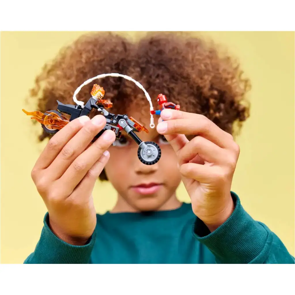 • 2 MINIFIGURKI LEGO® ǀ MARVEL – Strzelający siecią Spider-Man i szkieletowy Ghost Rider z płonącymi włosami zapraszają dzieci do kreatywnej zabawy