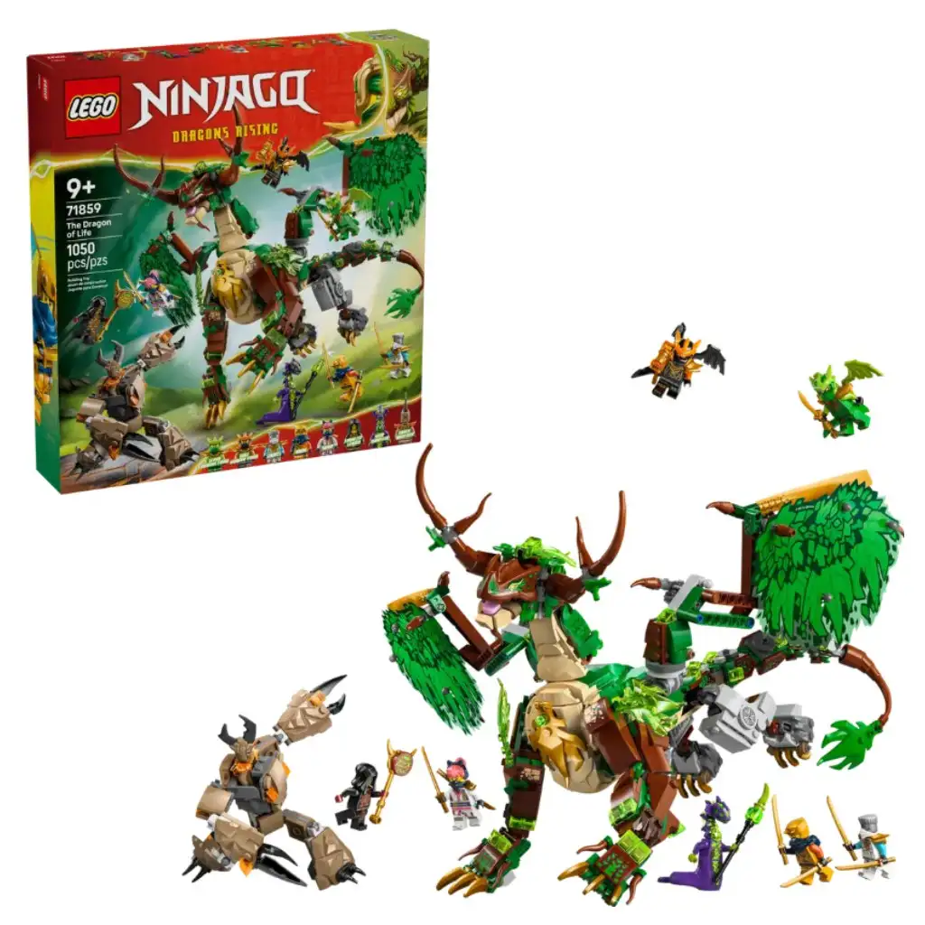 Chłopcy i dziewczynki powyżej 9 roku życia z ekscytacją będą składać ten zestaw LEGO® NINJAGO® Smok Życia (71859), zanim odegrają sceny z 4. sezonu serialu telewizyjnego Królestwo Smoków. Ten zabawkowy smok może szeroko rozpościerać lub składać skrzydła, posiada też ruchomą szczękę, głowę, szyję, nogi, kostki, pazury, ogon oraz siodło dla minifigurki. Zestaw zawiera boczną konstrukcję z drzewem i roślinami, którą dzieci mogą obracać, a która kryje złoty miecz, oraz ruchomego minirobota z kokpitem dla minifigurki. Do odgrywania wielkich bitew dostępnych jest 8 minifigurek ninja: Zane, Sora, Arin, Lloyd i Cole jako smoki, a także złowroga trójka: gryzący potwór, ziemny potwór i przywódca Lojalistów. Zestawy LEGO NINJAGO pozwalają fanom ninja zanurzyć się w świecie wyobraźni i bawić się kreatywnie ze swoimi bohaterami. Dzięki aplikacji LEGO Builder dzieci mogą z pewnością siebie budować zestawy — powiększać i obracać modele w 3D oraz śledzić swoje postępy za pomocą intuicyjnych cyfrowych instrukcji. Zestaw zawiera 1050 elementów.