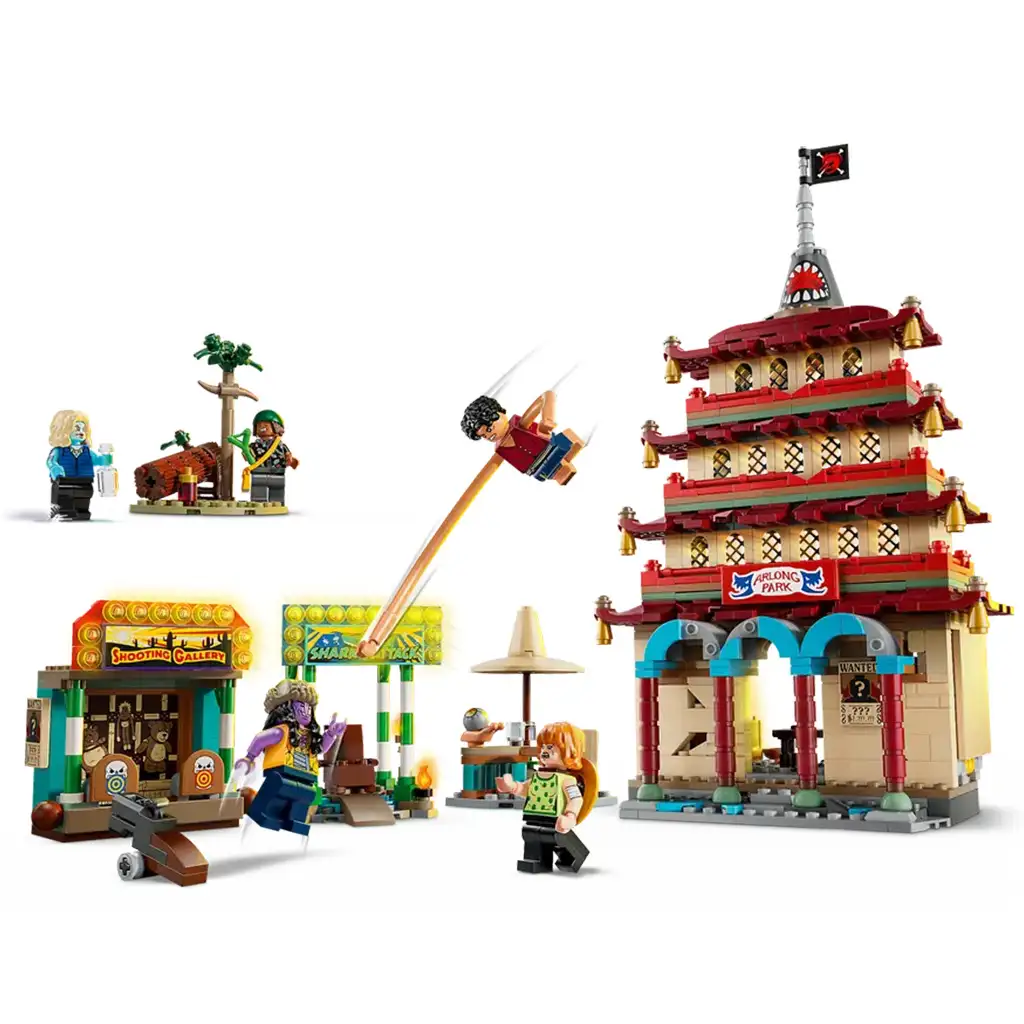 W tym zestawie konstrukcyjnym znajdują się minifigurki Luffy’ego (z wydłużanymi ramionami), Nami, Usoppa, Arlonga i Chu. Podczas bitwy dzieci mogą przewrócić model pagody, mocno uderzając w dach, a na strzelnicy trafić w zabawne cele za pomocą miotaczy dysków. Zły Arlong może zostać posadzony na tronie w budynku rekinów. Chu może zdobyć napój w budce, a w lesie znajdziesz kultową butelkę ketchupu. Zestaw zawiera miotacze dysków i akcesoria, takie jak 3 tabliczki „Wanted” (poszukiwany). Jeśli budujący szukają cyfrowych wrażeń, mogą powiększać i obracać modele w 3D oraz śledzić swoje postępy w intuicyjnej aplikacji LEGO Builder. Zestaw składa się z 926 elementów.