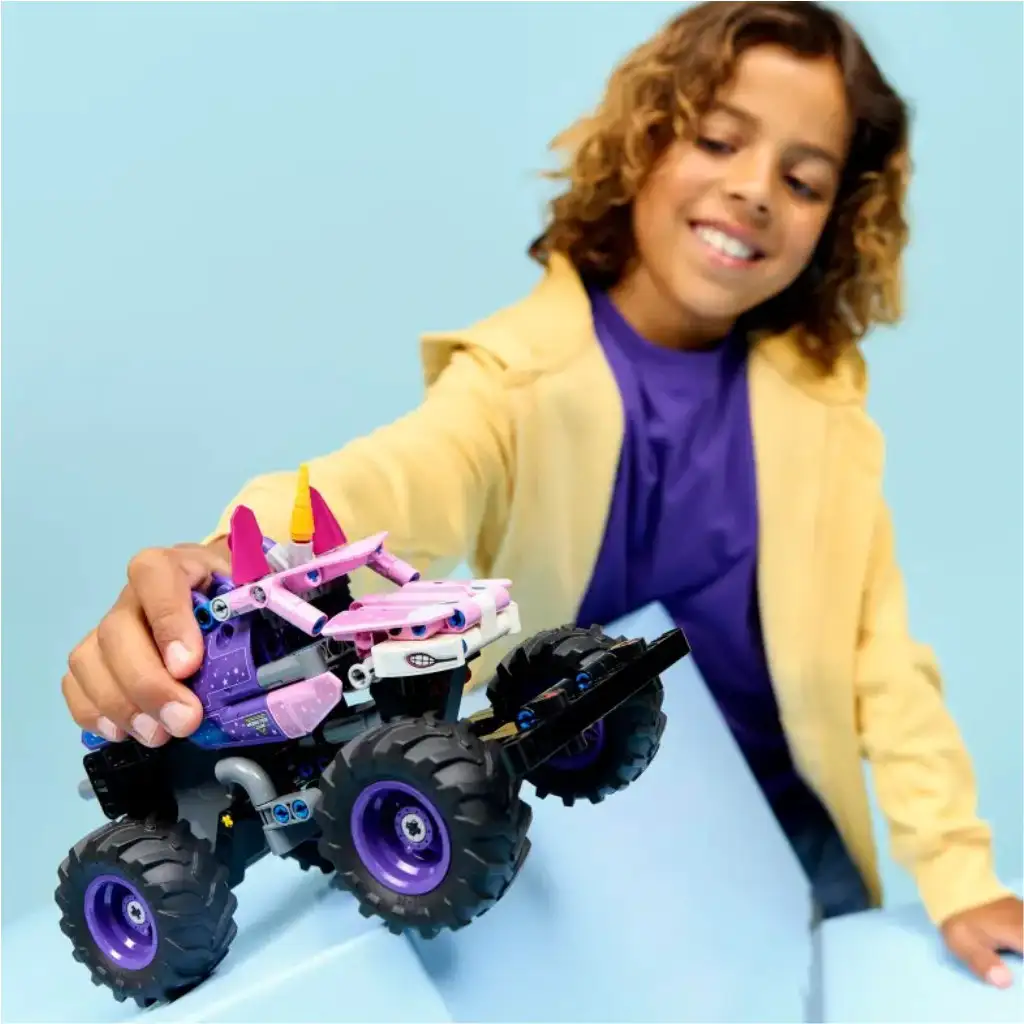 • ZESTAW KONSTRUKCYJNY MONSTER JAM™ – LEGO® Technic Monster Jam Sparkle Smash™ z napędem wstecznym (42220) zapewnia godziny zabawy chłopcom i dziewczynkom od 7 roku życia, którzy uwielbiają monster trucki i zabawki z jednorożcami