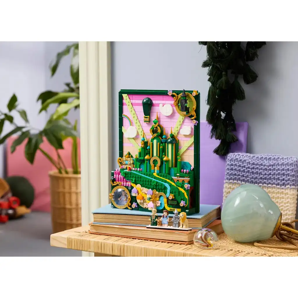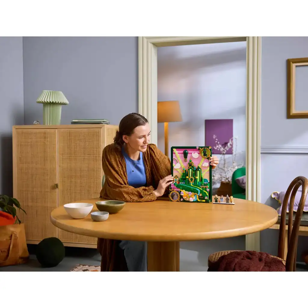 To artystyczny prezent Wicked dla kobiet, mężczyzn i dorosłych fanów, który ożywia w 3D filmowe momenty. Ta kolorowa dekoracja przedstawia ważne miejsca, takie jak Uniwersytet Shiz, Munchkinland i Szmaragdowe Miasto. W dekoracji ukryte są bańka Glindy, zaczarowany las oraz tajny schowek, w którym ukrywają się 4 postacie (minifigurki LEGO: Dorothy Gale, Tchórzliwy Lew, Strach na Wróble i Blaszany Drwal). Czeka tu na Ciebie wiele innych niespodzianek do odkrycia!