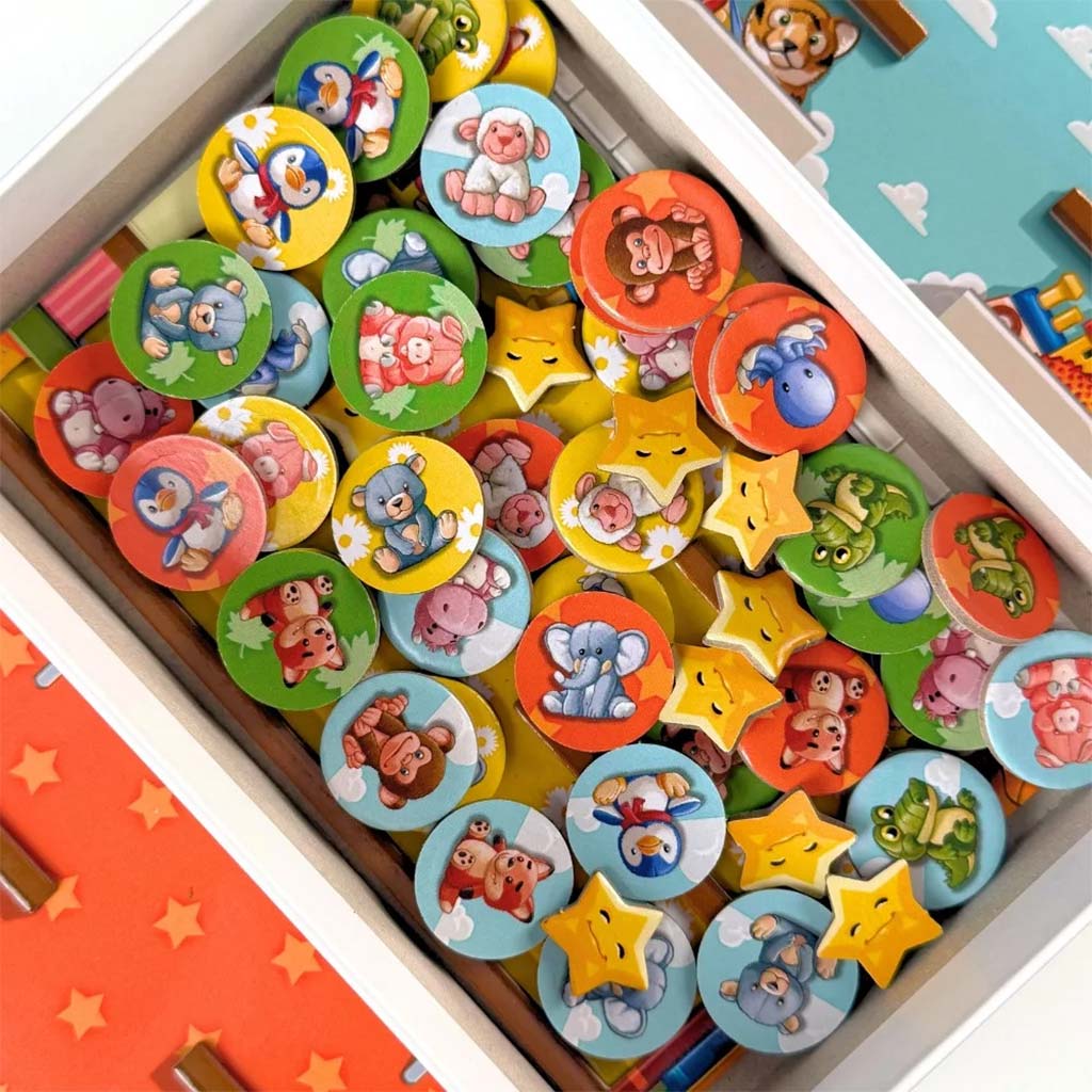 - Zawartość pudełka: 40 żetonów z wizerunkiem pluszaków (po 10 na gracza), 4 plansze sypialni (po jednej na gracza), 24 karty z celami (łatwy tryb z jednej strony, trudny z drugiej), 9 gwiazdek
