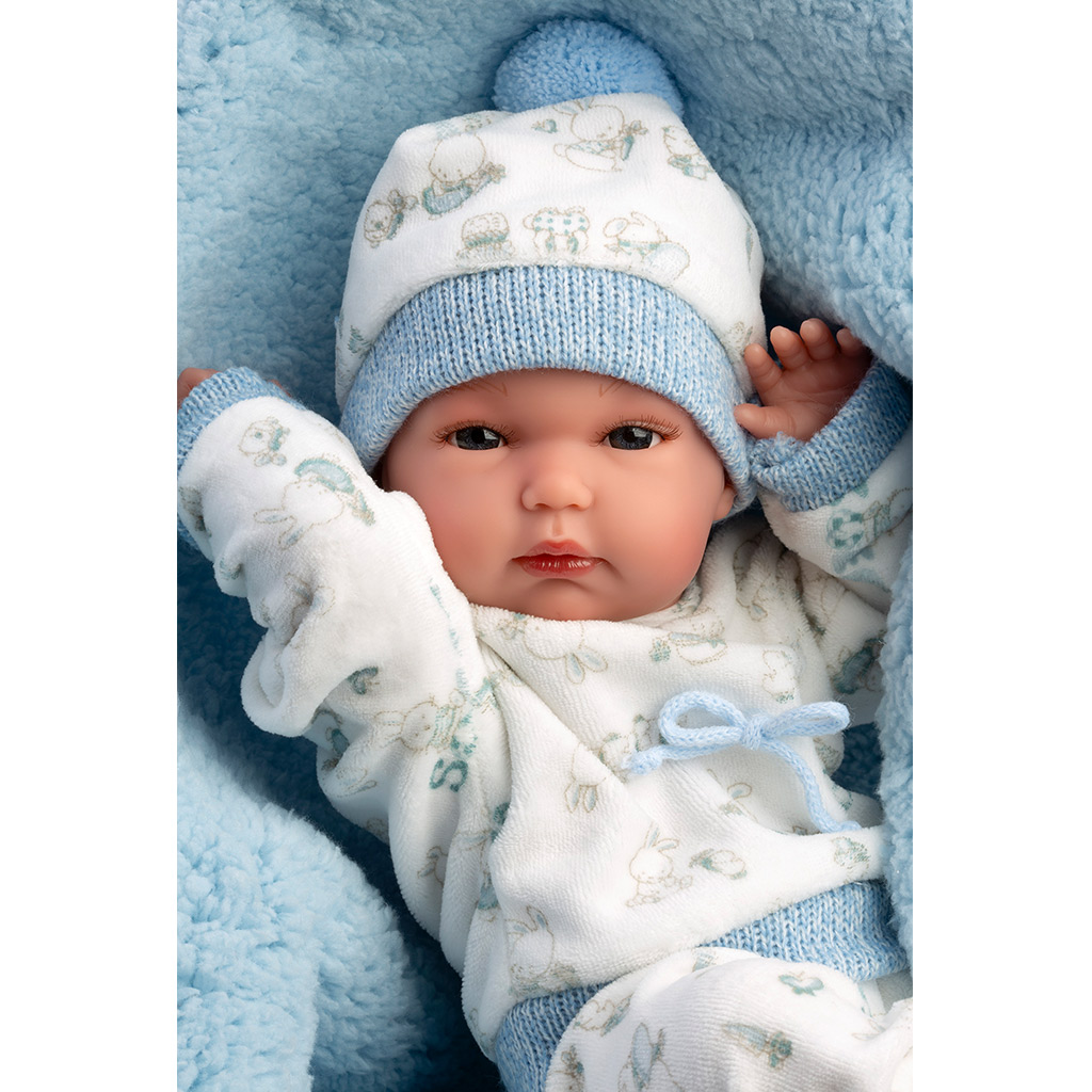 Llorens: Bimbo, 35 cm, noworodkowa lalka z butelką i kocykiem to doskonały wybór, jeśli szukasz naprawdę realistycznej i ujmującej zabawki dla swojego dziecka. Na zdjęciu lalka odpoczywa na miękkim, niebieskim kocyku, trzymając w ręce butelkę, co dodatkowo zwiększa realizm zabawy. Uroczy wyraz twarzy i szczegółowe wykonanie ułatwiają maluchom opiekę nad nią — karmienie i usypianie. Ciepłe, wygodne ubranko i czapeczka sprawiają, że lalka zawsze „dobrze się czuje” podczas zabawy.