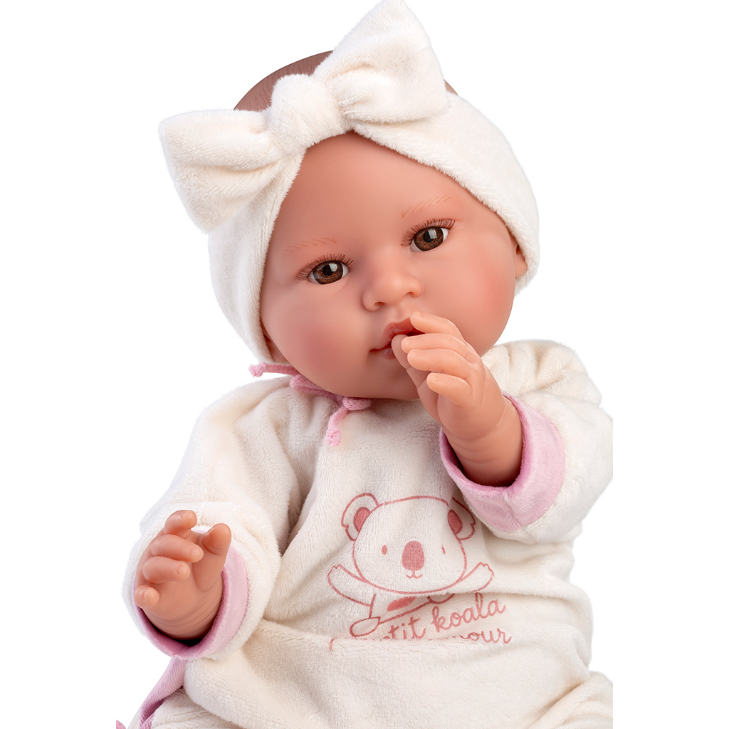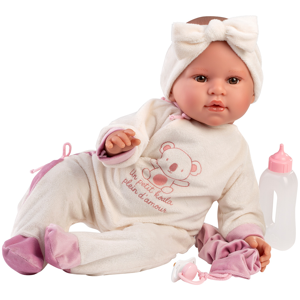 Llorens: Lea, 45 cm płacząca lalka z smoczkiem w pajacyku z motywem koali.Llorens: Lea, 45 cm płacząca lalka z smoczkiem w pajacyku z motywem koali.