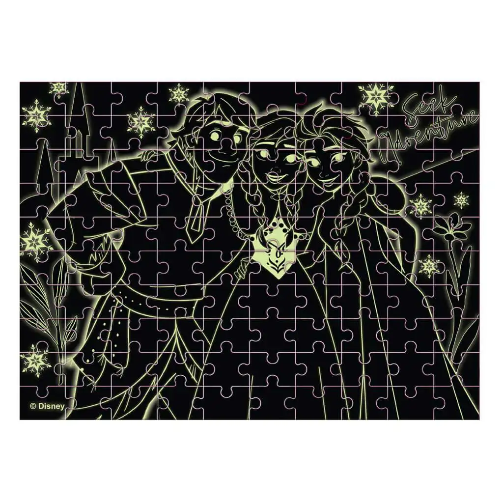 Ta 100-elementowa układanka z motywem Krainy Lodu to nie tylko barwny obrazek, ale także ożywa w ciemności dzięki fosforyzującym wzorom, zapewniając ekscytującą zabawę zarówno w dzień, jak i w nocy.