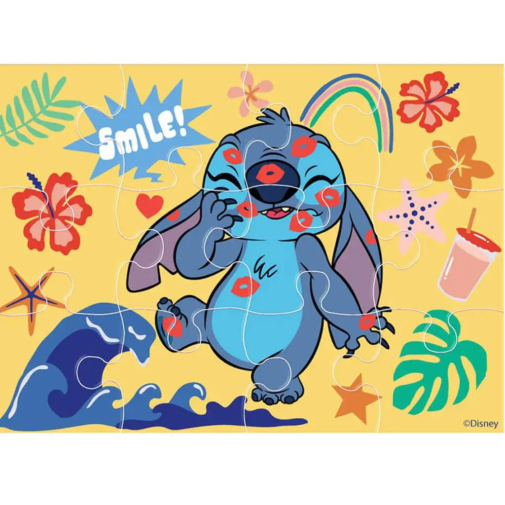 W pudełku znajdują się cztery różne układanki: jedna 12-elementowa, jedna 15-elementowa, jedna 20-elementowa i jedna 24-elementowa. Taka różnorodność doskonale wspiera rozwój motoryki małej, rozpoznawania kształtów i koncentracji już od 3. roku życia. Żywe kolory puzzli, tropikalny klimat i uroczy uśmiech Stitcha na pewno przyciągną uwagę dzieci.