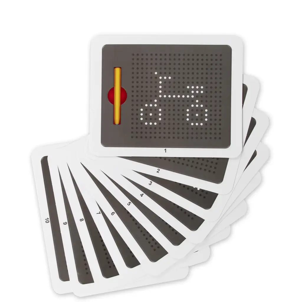 Magnetyczna tablica do rysowania z kulkami i długopisem oferuje Twojemu dziecku wyjątkowe i kreatywne doświadczenie rysowania. W tablicy znajdują się małe metalowe kulki, które można przyciągać do powierzchni za pomocą magnetycznego długopisu, dzięki czemu powstają rysunki i wzory. Dzięki dołączonym kartom z wzorami dzieci mogą łatwo śledzić obrazki lub tworzyć według własnej wyobraźni. Po skończeniu rysunku kulki można po prostu wcisnąć z powrotem na miejsce, dzięki czemu tablica jest wielokrotnego użytku. Zabawka świetnie rozwija motorykę małą, zręczność i koncentrację, jednocześnie w zabawny sposób wprowadzając dzieci w świat rysowania i kształtów. Doskonały wybór do zabawy w domu, w podróży lub jako prezent.