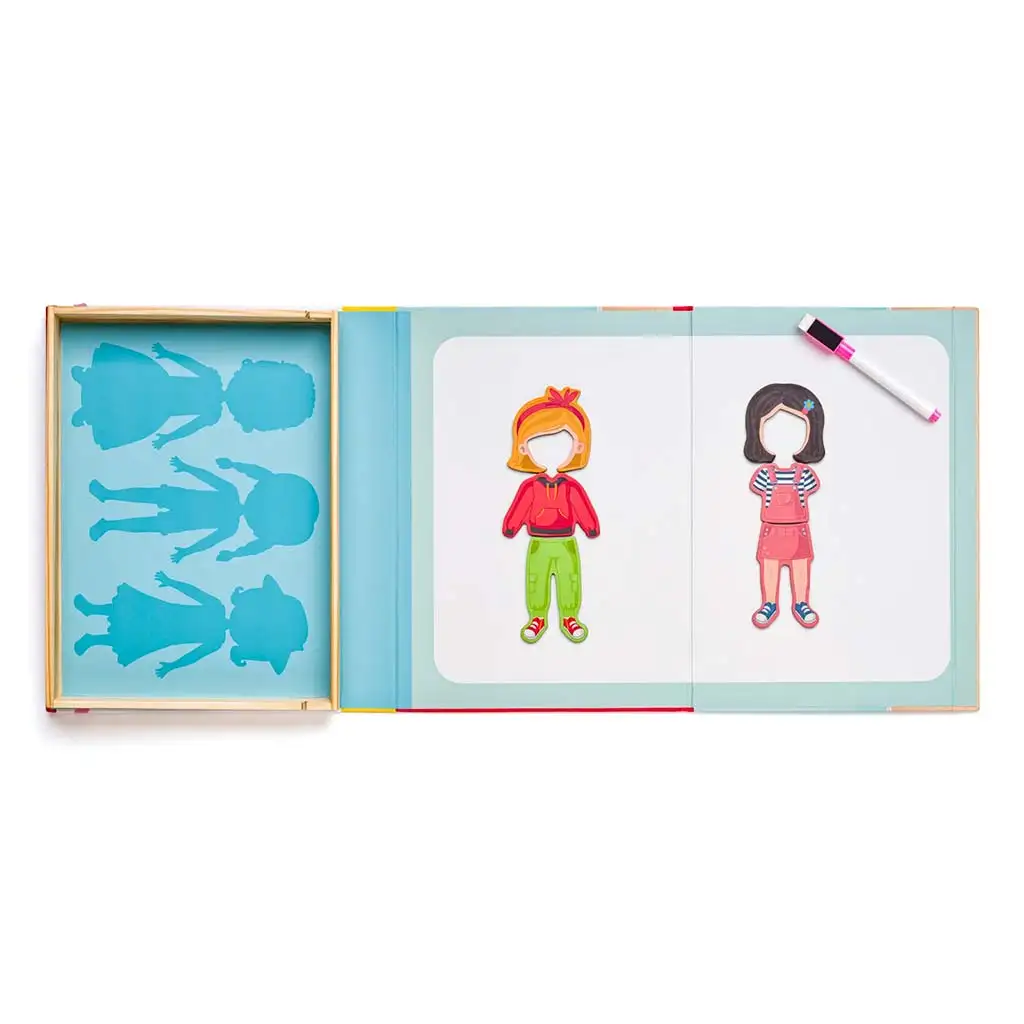 Pudełko w kształcie książki z zamknięciem zapewnia praktyczne przechowywanie, dzięki czemu elementy się nie gubią i jest idealne w podróży. Wewnętrzna magnetyczna tablica daje stabilne podłoże do tworzenia, a dołączonym pisakiem suchościeralnym możecie nawet rysować dodatkowe detale wokół postaci. Zabawka rozwija motorykę małą, kreatywność, umiejętność wyrażania siebie i łączenia elementów, jednocześnie zajmując dziecko na długi czas.