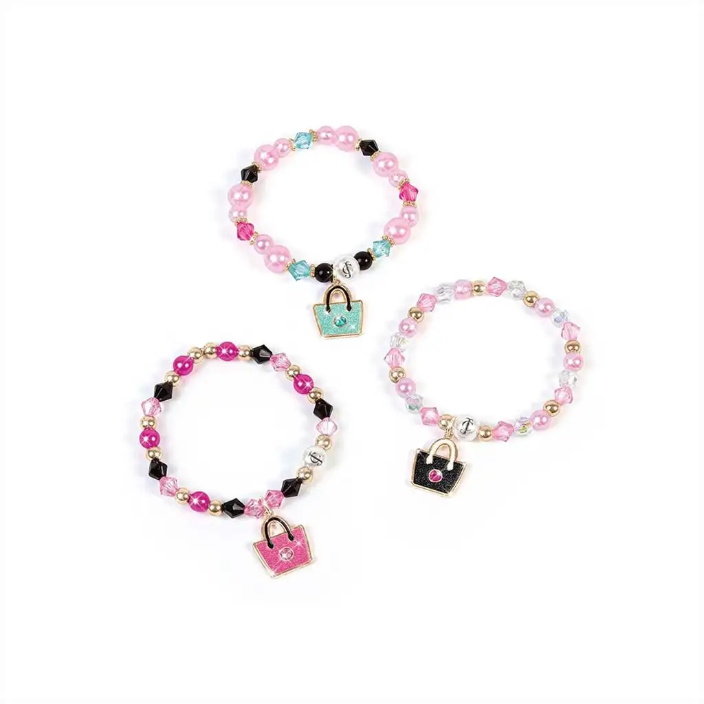 W komplecie znajdują się piękne koraliki, eleganckie zawieszki-charm oraz 3 wyjątkowe mini torebki, które mogą służyć nie tylko do przechowywania, ale także jako oryginalne dodatki. Dzieci mogą dowolnie łączyć odcienie różu, złota, czerni i turkusu, tworząc całkowicie unikalną biżuterię. Bransoletki są nawlekane na elastyczną żyłkę, dzięki czemu są wygodne do noszenia i można je w każdej chwili przebudować.