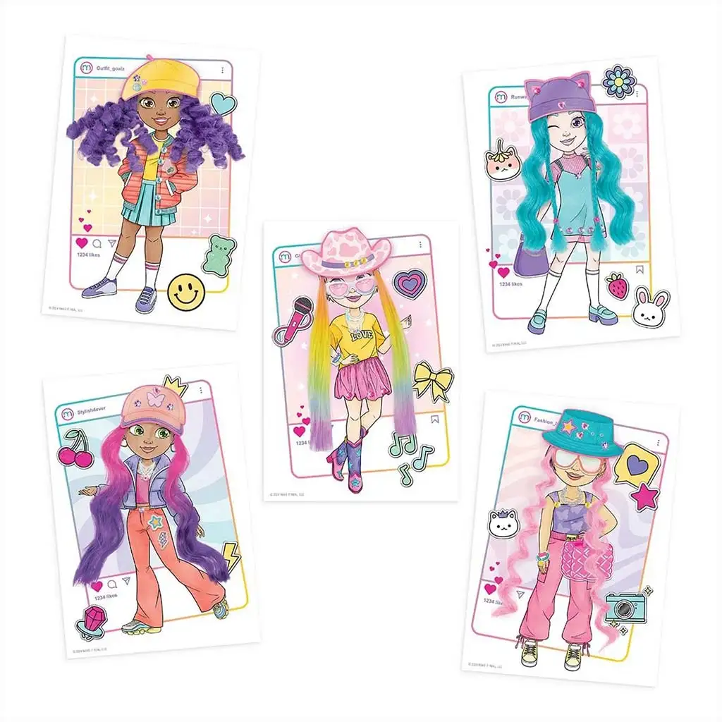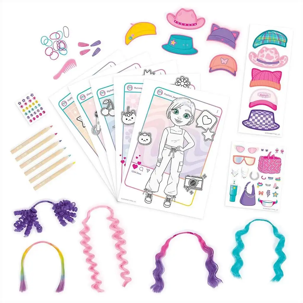 Zestaw zawiera 5 różnych kart modelek, które można ozdabiać dołączonymi kolorowymi kredkami, naklejkami i dodatkami. Prawdziwie wyjątkowe doświadczenie zapewniają wymienne kolorowe pasemka włosów, które można mocować do figurek, dzięki czemu można wypróbować zupełnie nowe fryzury. Kapelusze, okulary przeciwsłoneczne, torebki i inne akcesoria pozwalają na tworzenie różnych stylów – od sportowego, przez boho, aż po ekstrawagancki.