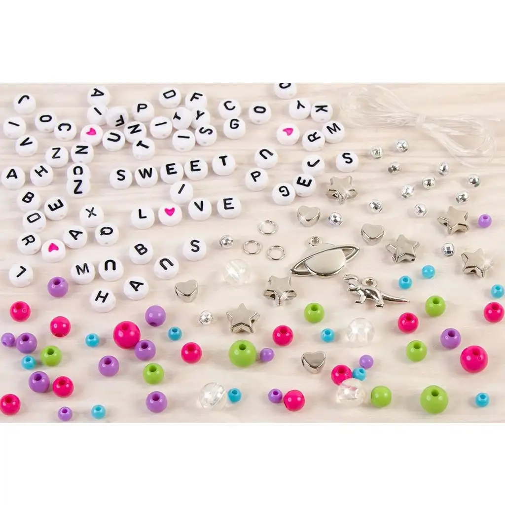 W pudełku znajduje się 60 koralików z literkami, dzięki czemu dziecko może ułożyć dowolne słowo lub imię – czy to własne imię, ulubione słowo, inspirującą wiadomość, czy tajny kod między przyjaciółkami. 70 kolorowych koralików (różowych, fioletowych, zielonych, niebieskich i przezroczystych) idealnie łączy się z literkami, a wyjątkowe zawieszki z efektem metalicznym, takie jak gwiazdka, serce, planeta czy dinozaur, sprawią, że gotowa bransoletka będzie jeszcze bardziej efektowna.