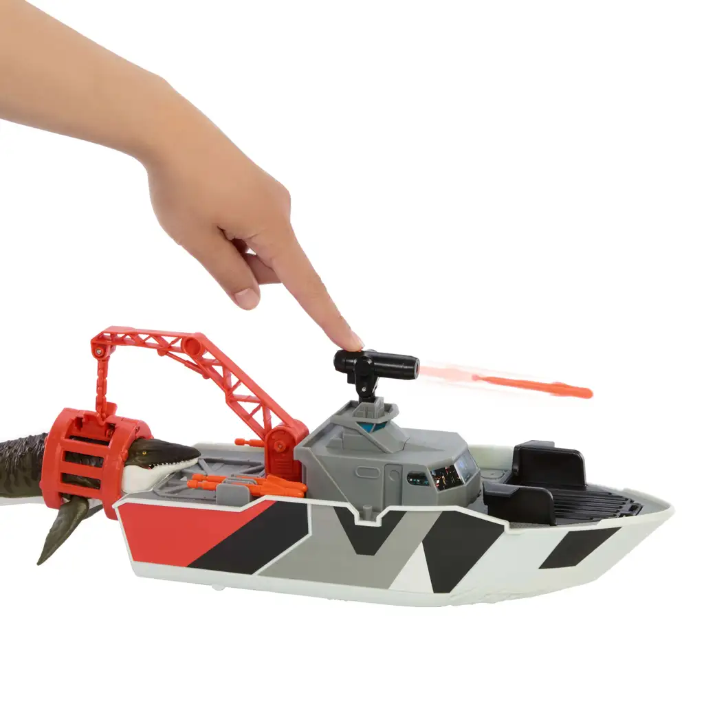 Statek o długości ponad 30 cm posiada realistyczne detale i funkcje, w tym działającą wyciągarkę, za pomocą której możesz schwytać 33-centymetrowego Mozazaura z ruchomymi szczękami i płetwami. Na dziobie statku znajduje się także wyrzutnia rakiet, do której dołączone są 2 rakiety harpunowe – jesteś więc gotowy do każdej akcji ratunkowej lub misji badania DNA!