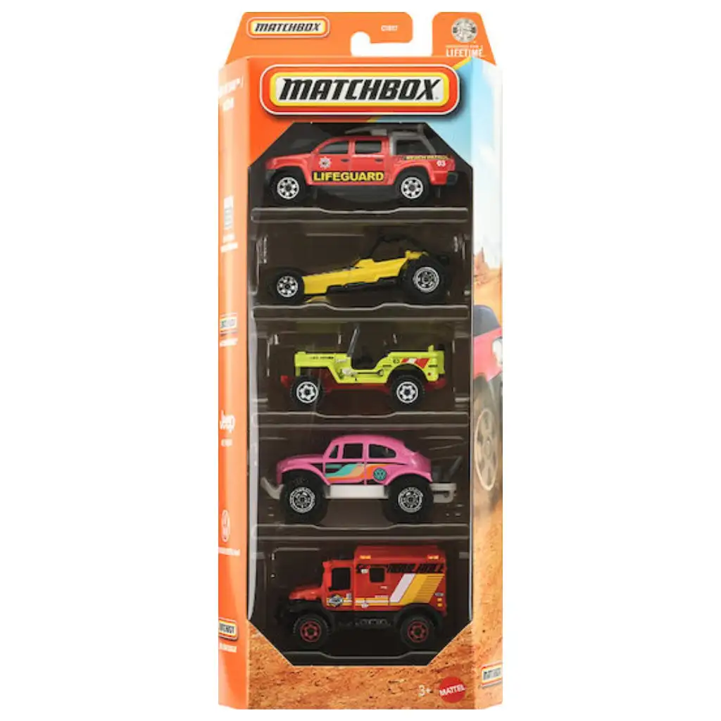 Zestaw 5 samochodzików Matchbox Ocean przywołuje klimat nadmorskich przygód i akcji na plaży w skali 1:64. Zestaw zawiera pojazdy związane ze światem plaż, portów i akcji ratowniczych przy wodzie, dzięki czemu można odgrywać ekscytujące historie i akcje ratunkowe. Szczegółowe wykonanie, żywe kolory i realistyczne napisy sprawiają, że zabawa jest jeszcze bardziej realistyczna. Dzięki wytrzymałej metalowej karoserii samochodziki dobrze znoszą intensywne użytkowanie. Kompaktowy rozmiar jest kompatybilny z innymi torami i zestawami Matchbox w skali 1:64, dzięki czemu kolekcję można łatwo rozbudować. Idealny wybór dla małych miłośników samochodzików i przygód od 3. roku życia.