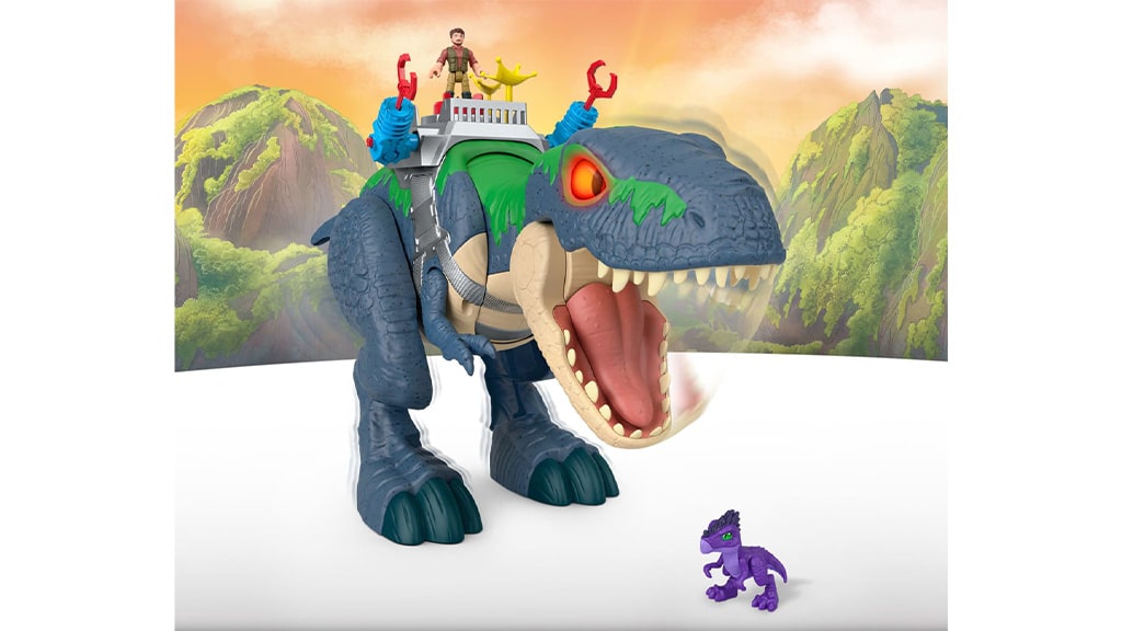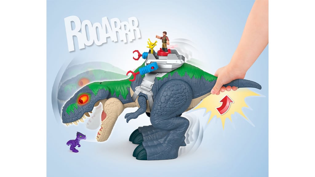 Ta ogromna zabawka dinozaur otwiera nowe możliwości opowiadania historii w wyobraźni dzieci. Przedszkolaki mogą zobaczyć, jak oczy dinozaura zmieniają kolor na zielony i doświadczyć ruchu gryzienia, gdy nacisną Power Pad. Do dzikiej zabawy mali odkrywcy mogą również aktywować tryb ataku, naciskając spust na ogonie dinozaura. W tym trybie T. rex ryczy, warczy i poruszając głową, chwyta mniejsze figurki. Dzieci mogą także rozwijać swoje zdolności motoryczne, ładując i wystrzeliwując cztery pociski. Ta zabawka nie tylko zapewnia rozrywkę, ale także wspiera rozwój kreatywności i zręczności, pozwalając dzieciom przeżywać ekscytujące przygody.Rodzicom warto wziąć pod uwagę miejsce do przechowywania, ponieważ zabawka jest dużych rozmiarów i nie ma przegródek na pociski oraz małe figurki. Opiekunom zaleca się, aby przed podarowaniem zabawki małym dzieciom włożyli do przegródki znajdującej się na spodzie zabawki 3 sztuki baterii AA. Ułatwi to korzystanie z zabawki i zapewni, że dzieci od razu będą mogły się nią cieszyć. Warto również wcześniej zadbać o bezpieczne przechowywanie akcesoriów, aby mniejsze elementy się nie zgubiły.