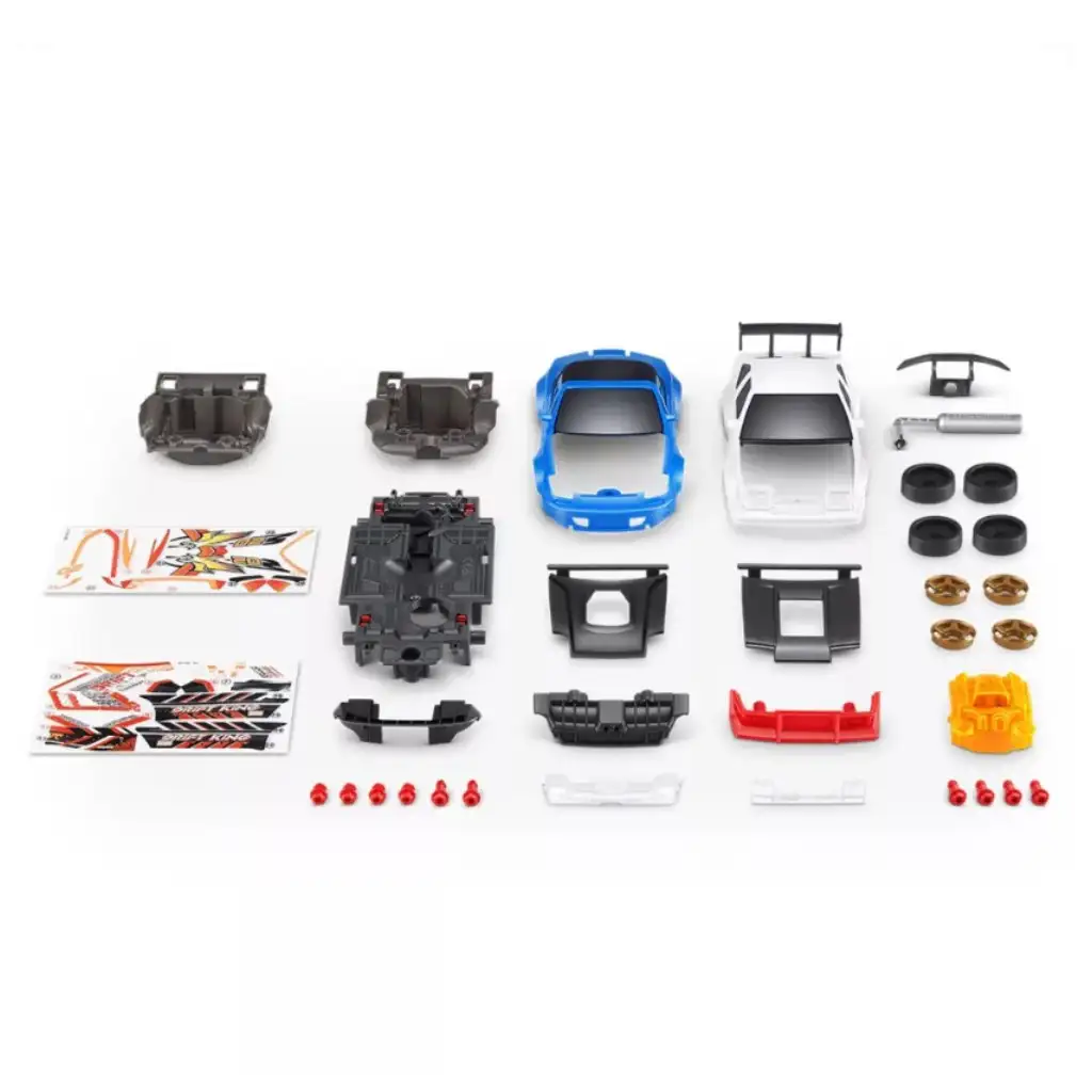 Elementy zestawu: podwozie, silnik, 4 koła, 2 karoserie, slime, naklejki