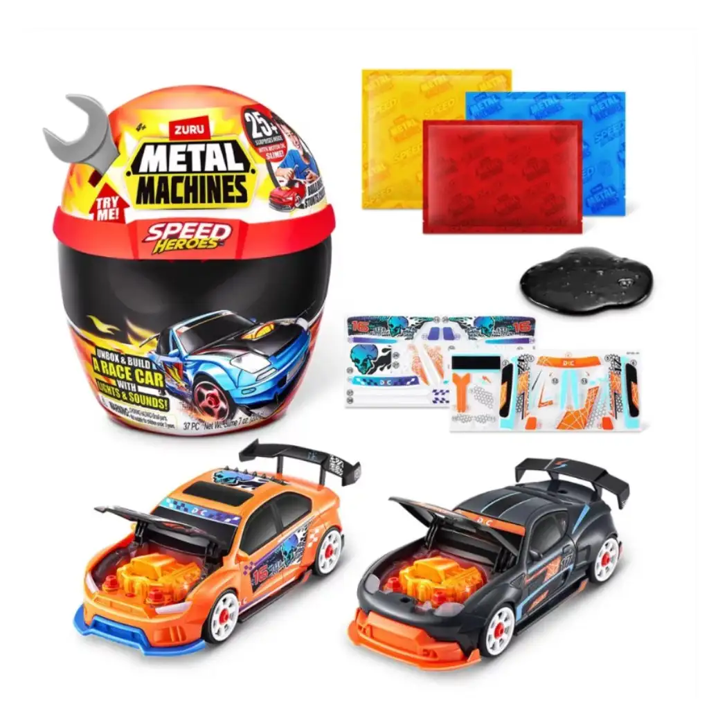 Rozbij specjalną kapsułę w kształcie kasku i rozpocznij zabawę w składanie! Zestaw niespodzianka Metal Machines Speed Heroes zawiera ponad 20 ekscytujących elementów, dzięki którym możesz zbudować i całkowicie spersonalizować swój własny samochód wyścigowy.