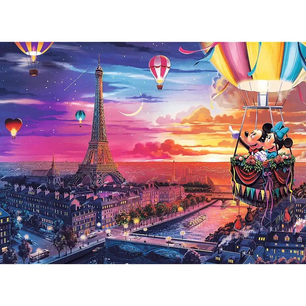 Pozwól, aby Mickey i Minnie przenieśli Cię do miasta romantyzmu dzięki tej przepięknej układance z 1000 elementów! Puzzle „Disney – Mickey i Minnie w Paryżu” przedstawiają magiczny wieczór w mieście świateł: para przemierza niebo balonem o zachodzie słońca, podczas gdy pod nimi lśnią wspaniałe budowle Paryża, w tym wieża Eiffla, nad brzegami Sekwany. Kolory ilustracji są ciepłe i przytulne, pełne balonów, gwiazd i bajkowego klimatu.