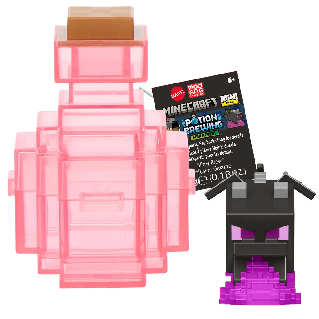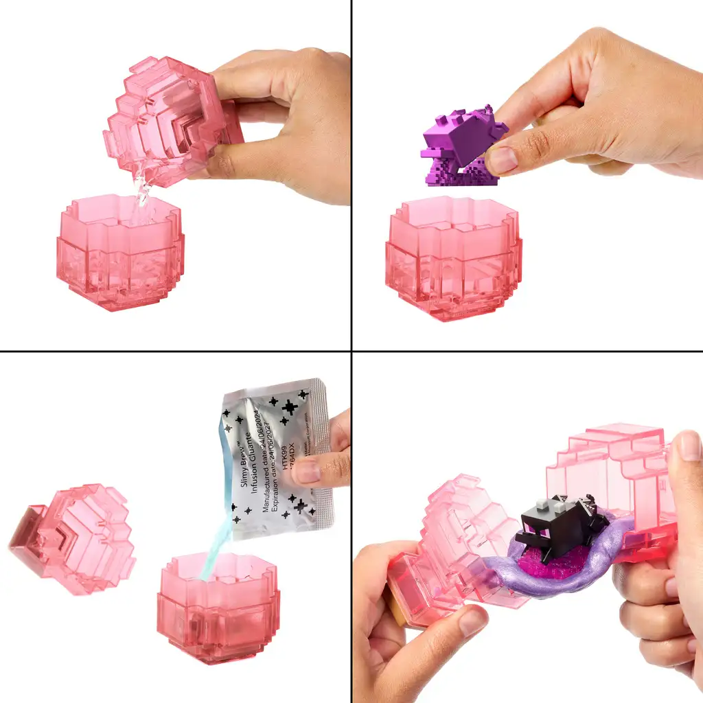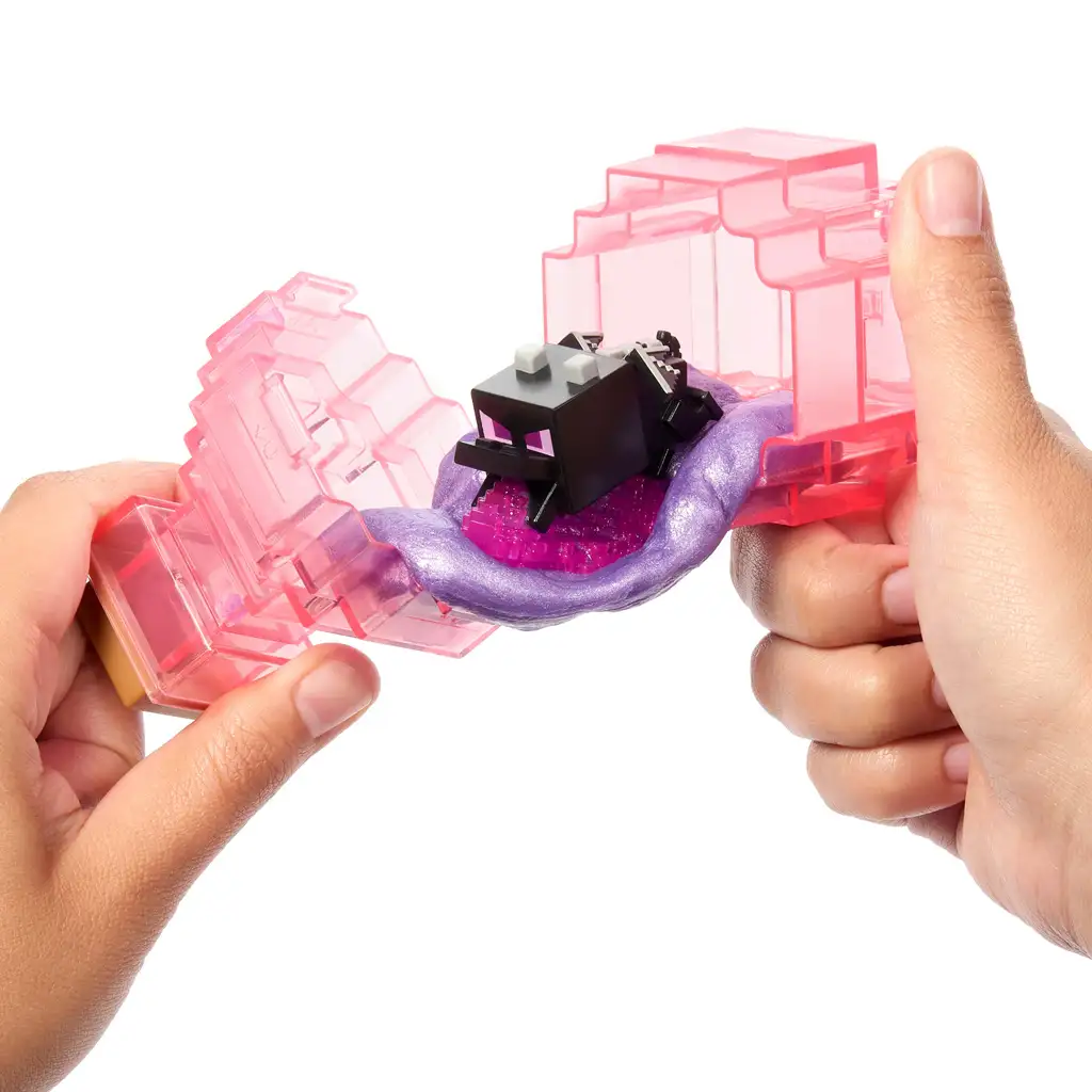 W opakowaniu znajduje się przezroczysty, różowy pojemnik w kształcie eliksiru, proszek do przygotowania slimeu oraz ukryta figurka. Dzieci dodają wodę do pojemnika, wsypują proszek slime i wrzucają tajemniczą szarą figurkę. Po wstrząśnięciu, z lepkiej masy wyłania się prawdziwa postać – tym razem jest to przerażająca głowa Ender Dragona, z której wydobywa się fioletowy „płomień” slime’u. Figurka została wykonana z wyjątkową, pikselową precyzją, całkowicie zgodnie ze stylem Minecrafta.