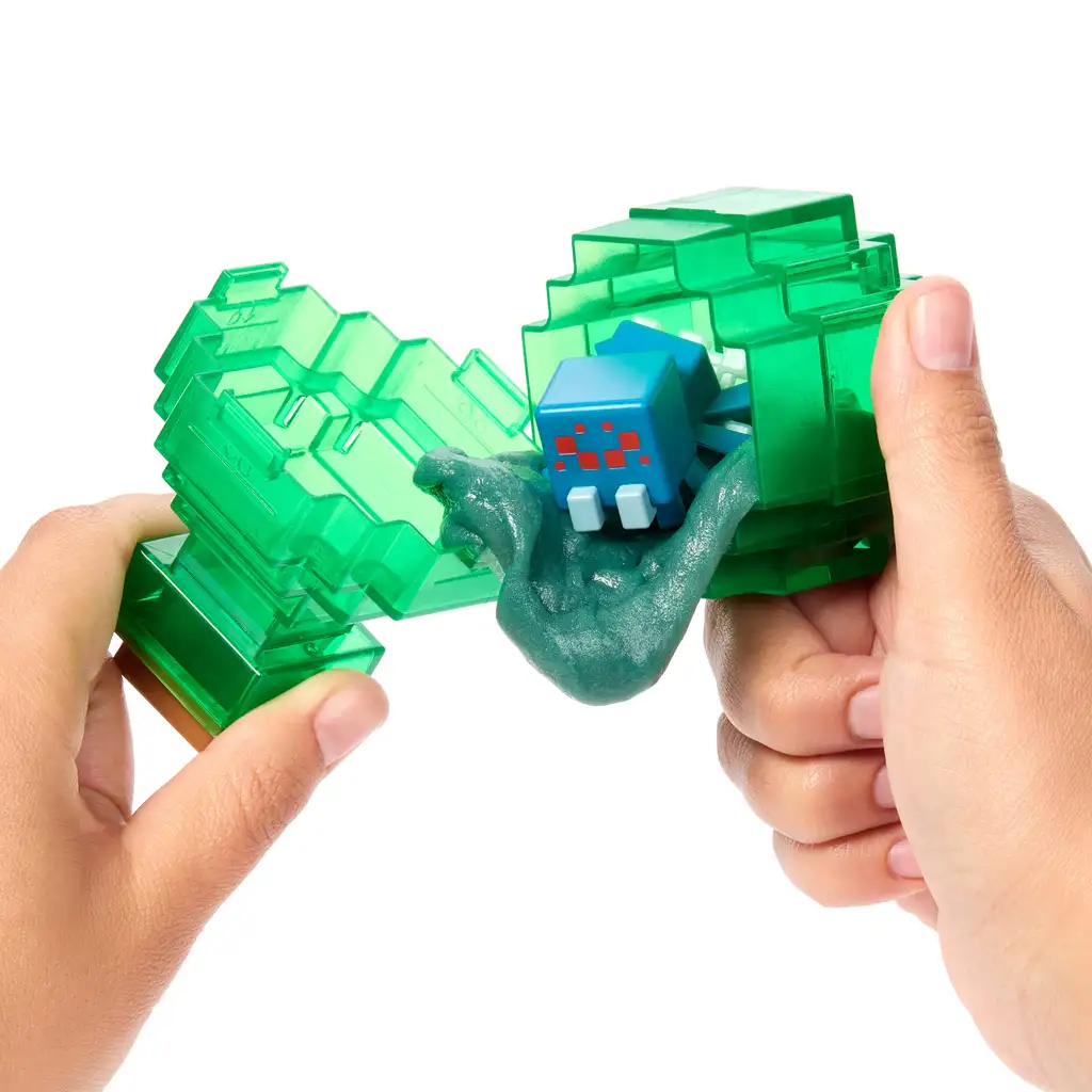 Zestaw zawiera przezroczysty, zielony pojemnik na miksturę w stylu Minecraft, czarną ukrytą figurkę, porcję proszku slime Potion Particles oraz oczywiście całą magię! Podczas zabawy dziecko napełnia pojemnik wodą, dodaje proszek slime, a następnie wrzuca figurkę. Po kilku ruchach slime zaczyna się mieszać i pojawia się prawdziwa figurka: tym razem to klasyczny pająk z Minecrafta o czerwonych oczach i przezroczystych odnóżach!