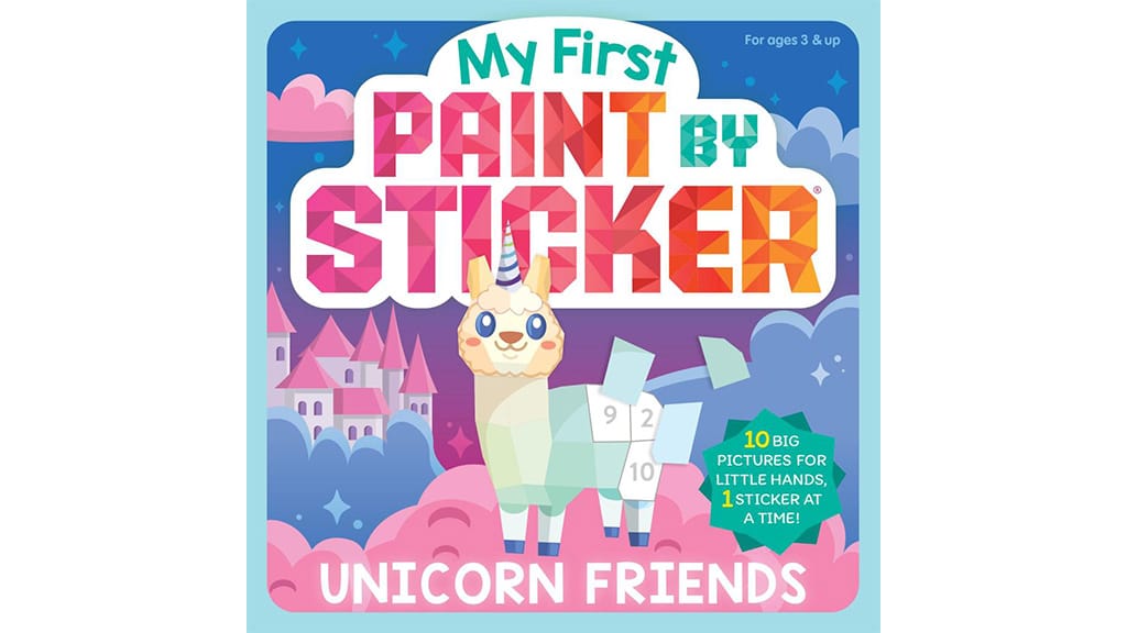 Możesz wprowadzić magiczne chwile do zajęć plastycznych dzięki tej idealnej także dla małych dzieci książce do malowania naklejkami. Na 10 stronach dzieci mogą wyszukiwać, odklejać i przyklejać naklejki, aby stworzyć jednorożce i inne magiczne stworzenia, na przykład „kitticorn” (koci jednorożec) oraz „turtlecorn” (żółwi jednorożec).