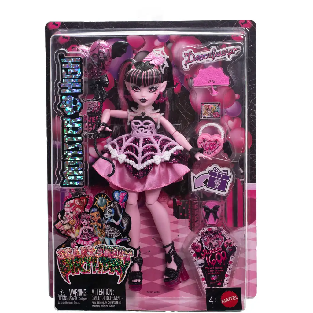 Przygotuj się na strasznie fajną imprezę z Monster High: Mistyczna Zabawa – lalką Draculaura! Ta stylowa wampirzyca należy do najmodniejszych uczennic potwornej szkoły, a teraz pojawia się w wyjątkowym, urodzinowym zestawie tematycznym, który sprawi, że zabawa stanie się jeszcze bardziej magiczna. Lalka zainspirowana jest popularnym światem Monster High, w którym najważniejsze są przyjaźń, akceptacja różnic i kreatywna ekspresja.