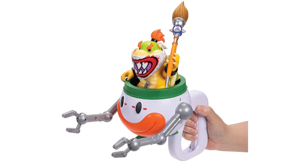 Urozmaicaj zabawę tą figurką akcji Bowser Jr.! Ten mały łobuz nosi teraz zupełnie nową maskę i pędzi w swoim słynnym Clown Car, który jest wyposażony w obracające się śmigło, zdejmowaną rączkę oraz ruchome ramiona aktywowane przyciskiem. Zestaw zawiera także arkusz naklejek, które pojawiają się po zwilżeniu wodą, oraz pędzelek z gąbką, aby zabawa była jeszcze bardziej kreatywna. Ta wyjątkowa edycja będzie ekscytującym i zabawnym dodatkiem do kolekcji każdego fana Super Mario!